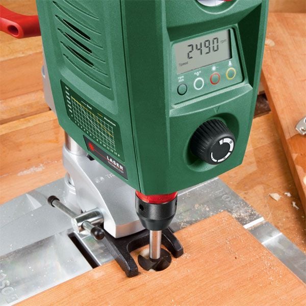 Настільна дриль PBD40 потужністю 710 Вт – 0603B07000 Характеристики продукту: Електронна індикація на цифровому дисплеї дозволяє точно й індивідуально регулювати швидкість обертання, а система Bosch Constant Electronic забезпечує постійну швидкість. Інноваційний цифровий індикатор полегшує зчитування глибини свердління.Це дозволяє виконувати серійне буріння, напр. в дерев’яних конструкціях. 2-швидкісна передача: висока потужність на 1-й передачі, висока швидкість обертання на 2-й передачі. Високоякісний свердлильний патрон без інструментів з автоматичним блокуванням свердла.Стопорне кільце гарантує ідеальне кріплення свердла. Вбудований лазер допомагає вам під час свердління: легко і точно просвердлюються отвори – з абсолютною точністю.Світлодіод забезпечує хороше освітлення робочої зони. Затискач також можна використовувати для зручного кріплення круглих елементів – це дозволяє отримати абсолютно точні результати свердління. Паралельна напрямна та велика робоча поверхня забезпечують точне та безпечне позиціонування заготовки. Ручка з м’яким покриттям забезпечує хороший контроль і комфорт роботи. Технічні дані: Номінальна потужність: 710 Вт Макс. діаметр свердління в сталі: 13 мм Макс. діаметр свердління в деревині: 40 мм Вага пристрою: 11,2 кг Швидкість холостого ходу (1-ша / 2-га передача): 200 – 850 / 600 – 2500 хв-1 Тип лазера: 1,5 Клас лазера: 2 Діапазон кріплення свердлильного патрона: 1,5 – 13 мм Хід: 90 мм Розміри основи (ширина x глибина x висота): 330 x 350 x 30 мм Стандартне обладнання: Паралельна напрямна Швидкоз’ємний затискач