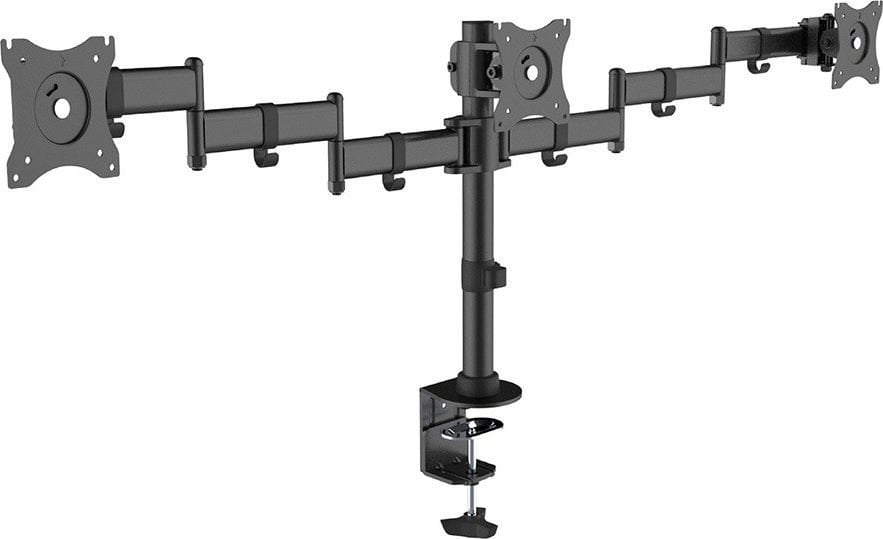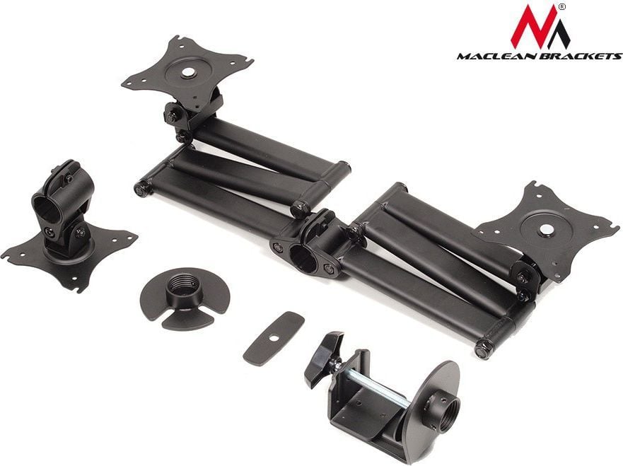 Простота та універсальний зовнішній вигляд настільного тримача Maclean для 3 моніторів 13″ – 27″ дозволяє дуже просто та невибагливо встановлювати його на робочий стіл або стільницю.Просто розташуйте кронштейн у зручному місці, а потім прикріпіть його за допомогою спеціального монтажного затискача.Тож вам не доведеться свердлити отвори, і ви не спотворите свій стіл.Кронштейн монітора виготовлений таким чином, щоб забезпечити комфорт при збереженні належної ергономіки під час роботи за столом.Ручка пофарбована в чорний колір, завдяки своїй універсальності підійде в будь-якому приміщенні.Додатково тут використана технологія порошкового фарбування, яка не тільки покращує колір, але й робить його стійким до стирання та запобігає відшаровуванню фарби від конструкції.Сама конструкція дужок продумана таким чином, щоб створювати враження стрункості, тому вона не буде надто кидатися в очі.Міцна конструкція У випадку з тримачем монітора дуже важливим аспектом є його конструкція, яка в майбутньому вплине на довговічність конструкції.Тримач Maclean MC-691 виготовлений з матеріалів найвищої якості (комбінація сталі, алюмінію під тиском і пластику), що забезпечує ідеальну підтримку навіть більш важких моніторів у правильному положенні, не піддаючи всю конструкцію пошкодженню.Це кріплення здатне підтримувати 3 монітори з максимальною вагою 24 кілограми, тому практично будь-яке рішення на ринку ідеально підходить для цього кріплення.Кронштейни побудовані таким чином, що на кожне з них можна повісити монітор з максимальним розміром матриці до 27 дюймів.Елементи тримача були відрегульовані для забезпечення стабільної та безпечної підтримки монітора.Це робить цей тримач ідеальним для більшості конфігурацій.Багатий функціонал Важливим питанням у контексті тримача для монітора є його функціональність.Для цього власника цього більш ніж достатньо.Кожен користувач повинен мати можливість пристосувати своє робоче місце до своїх потреб, і саме це забезпечує ручка.Він пропонує можливість регулювати кут нахилу від -45° до 45°, що робить розміщення монітора легшим, ніж будь-коли раніше.Крім того, тримач пропонує регулювання довжини від центру труби, тож ви можете збільшувати або зменшувати монітор відповідно до ваших уподобань.Групове ручне регулювання висоти дозволяє встановити всі монітори на однаковій висоті, завдяки чому ви можете налаштувати ідеальну висоту для свого робочого місця.Тримач також дозволяє регулювати відстань між моніторами, щоб ви могли розташувати їх так, щоб вони виглядали як один великий екран.Сумісність із стандартом VESA Стандарт VESA — це стандартизована відстань між монтажними гвинтами, які дозволяють прикручувати монітор до кріплення.Описуваний продукт відповідає стандартам VESA 75×75 (75 на 75 мм) і 100×100 (100 на 100 мм).Завдяки цьому рішенню вибрати потрібний монітор або телевізор і тримач буде дуже просто і, що важливо, швидко.У набір також входить повний набір кріпильних гвинтів та інструкції, які легко пояснять і допоможуть встановити пристрій на тримачі.Крім того, ви зможете організувати підвішування кабелів за допомогою функціональних гачків, стаціонарно закріплених на рукоятках, завдяки яким ви будете підтримувати ваші кабелі в чистоті та порядку.Ваше робоче місце буде виглядати не тільки професійно, але й естет