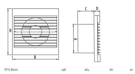 Настінний вентилятор STYL 200S – 007-0007 Технічні дані: ØA=198 B=264 C=80 D=20 Потік повітря: 400 м3/год Статичний тиск: 60Па Статичний тиск: 6,12 мм H2O Акустичний тиск: 48 дБ(А) Напруга живлення: 230/50 В/Гц Швидкість двигуна: 2500 об./хв. Потужність: 35 Вт Споживаний струм: 0,22 А Макс.робоча температура: 40°C Вага: 1,05 кг Рівень захисту: X2IP Наведені розміри відповідають кресленню в галереї
