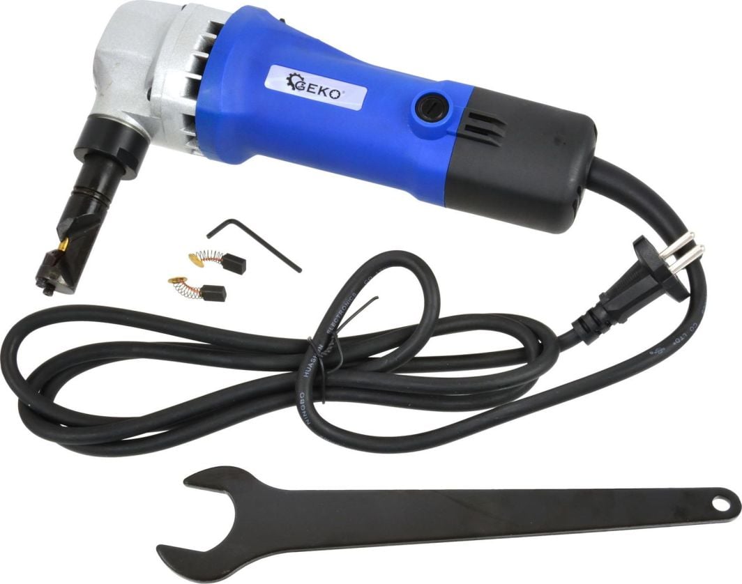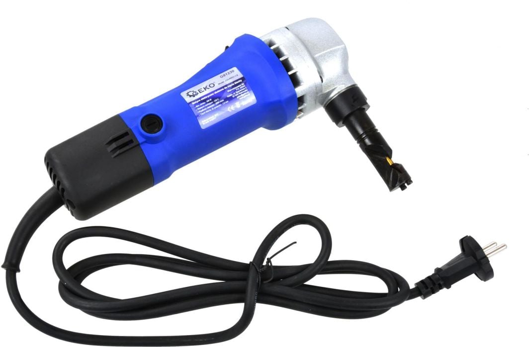 Електричні стрибучі ножиці для різання листового металу.Ножиці дозволяють точно різати різні типи листового металу.Вони ідеально підходять для різання прямого, трапецієподібного, гофрованого металу, металочерепиці та ін. Вони легко ріжуть по прямій лінії, по дузі та при різанні за заданим шаблоном.Пристрій оснащений ефективним електродвигуном потужністю 500 Вт, який створює хід ножа 2000 ударів/хв.Це забезпечує швидке і точне різання листового металу товщиною до 2,3 мм (у випадку алюмінієвого листа).Характеристики продукту: високоякісний двигун з реальною потужністю 500 Вт, що створює хід ножа 2000 ударів/хв., забезпечує швидке та точне різання, можливість різання листового металу товщиною до 2,3 мм. Можливість швидкої та безпроблемної заміни вугільних щіток. Сертифікат CE. Технічні характеристики: Напруга живлення: 230 В Потужність: 500 Вт. Кількість ходів на холостому ході: 2000 ударів/хв. Максимальна товщина різання пластин: твердий сталевий лист – 1,2 мм;лист з м’якої сталі – 1,6 мм;алюмінієвий лист – 2,3 мм Мінімальний радіус різу: 40 мм Ширина канавки, вирізаної ножицями: 5 мм
