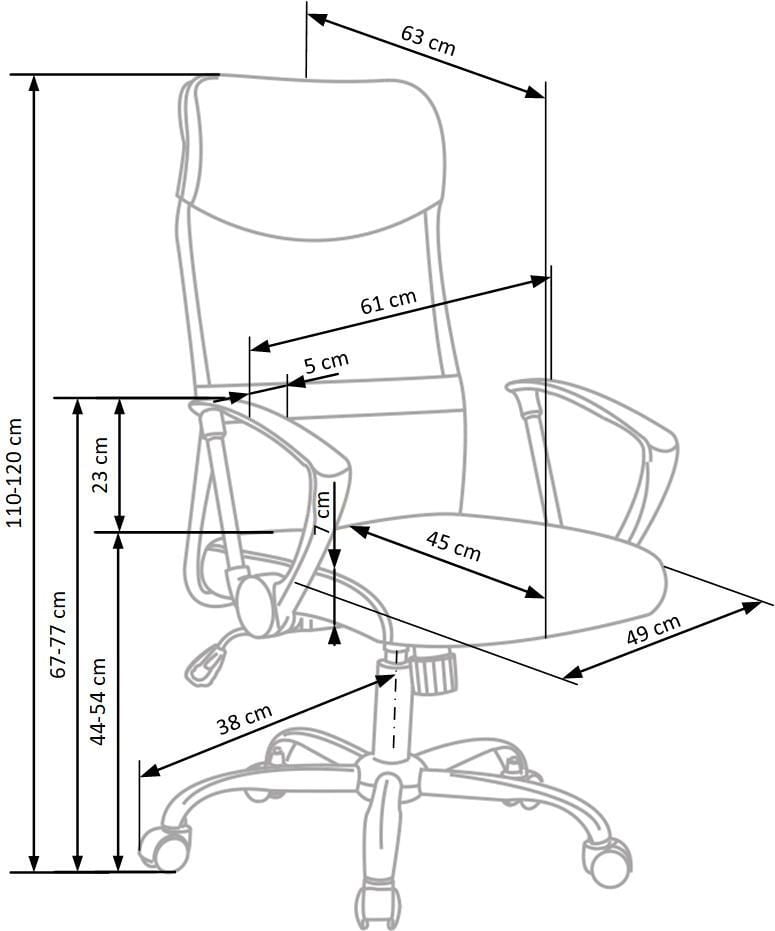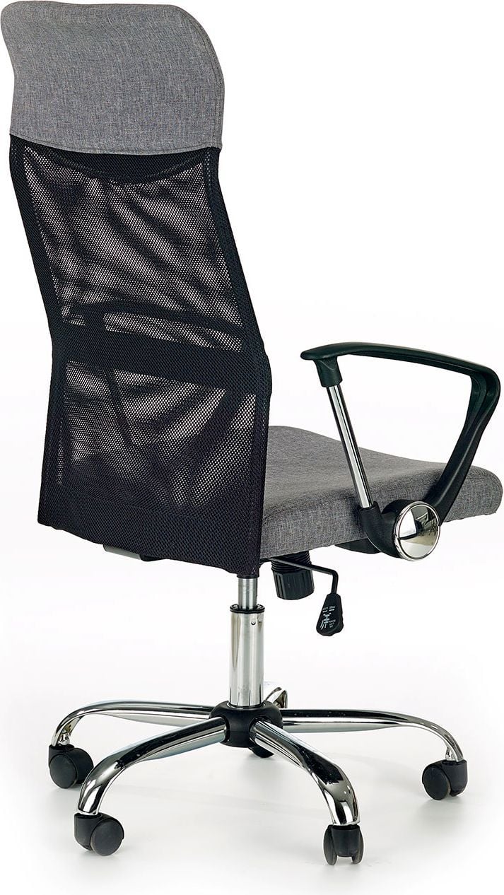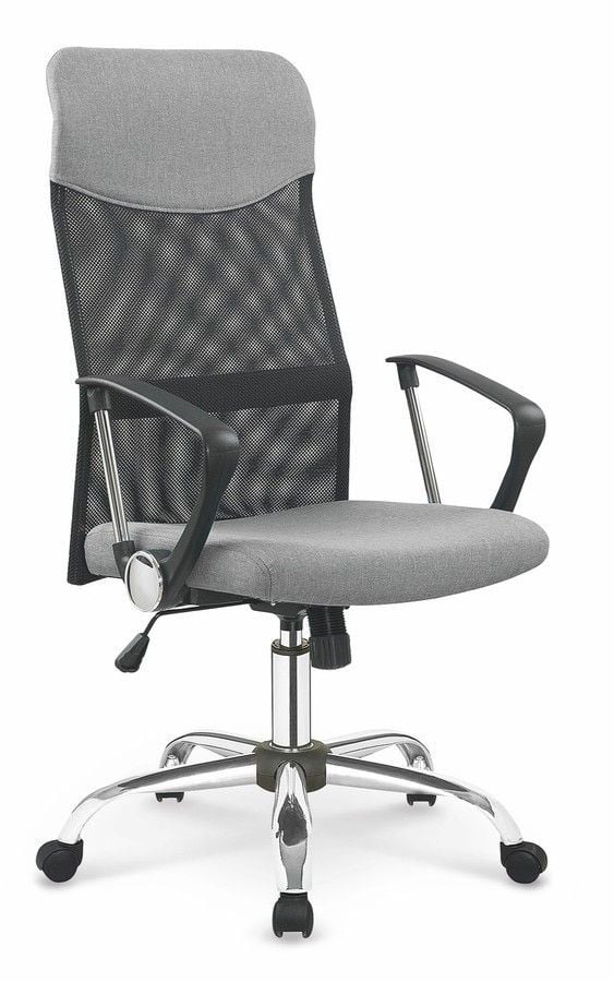 Офісне крісло Halmar Vire 2 сірий Офісне крісло Vire 2 має інтегрований підголівник у вигляді високої профільованої спинки – це просто частина спинки.Підголівник виготовлений з тканини попелястого кольору.Спинка висока – з сірої сітки.Використання сітки надає стільцю дуже хороші властивості циркуляції.Сидіння крісла Vire зручне.Він спрофільований так, що краще адаптується до користувача.Сидіння оббито тканиною – приємною на дотик, простою в обслуговуванні і міцною – сірого кольору.Підлокітники фіксовані – виготовлені з міцного сталевого каркасу.У верхній частині підлокітників виробник Halmar використав міцний матеріал чорного кольору.Профіль підлокітників спрямований вниз, що робить розташування передпліч зручним.Механізм і його функції: Нахил: у кріслі використовується перевірений механізм нахилу.Після зняття фіксатора він дозволяє вільно «гойдатися» в кріслі – тоді спинка слідує за спиною користувача.Тиск спинки регулюється за допомогою гвинта, розташованого під сидінням.Механізм Tilt має можливість фіксації спинки в робочому положенні.Механізм розміщений на пневмоприводі, за допомогою якого ми плавно регулюємо висоту сидіння крісла.Основа одного з поворотних стільців Vire 2 виготовлена ​​зі сталі та хромована, що робить її легкою в чищенні та естетичною.Основа стійка, її ширина 76 см