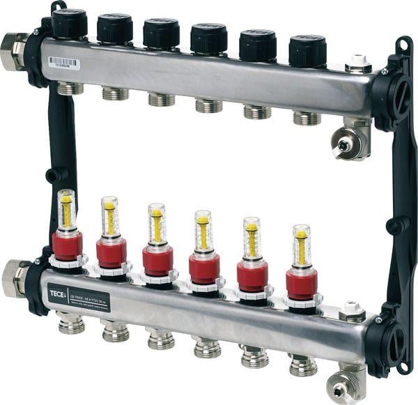 Маніфольд 8 секцій з нержавіючої сталі (77310008) Опис: Маніфольд складається з: балки колектора з великим об’ємом камери, що значно покращує властивості потоку. Поверхня балок відшліфована і оснащена звукопоглинаючими монтажними кронштейнами з функцією швидкого монтажу. Інтегровані клапанні вставки оснащені подвійними ущільнювальними кільцями на штовхачі. Конічна головка клапана також оснащена додатковим ущільненням. Тип ущільнювального кільця для безпечного закриття опалювальних контурів. Витратоміри з діапазоном регулювання 0,5 – 4,0 л/хв з блокуванням налаштування та можливістю перекриття потоку відповідають стандарту PN-EN 1264-3.Витратоміри також мають можливість демонтажу так званих «склян» під тиском системи