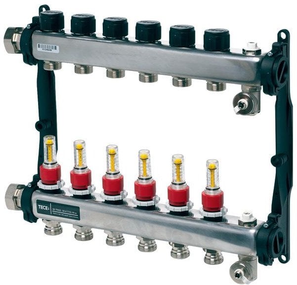 Розподільник з нержавіючої сталі, 4 секції (77310004) Опис: Розподільник складається з: розподільної балки з великим об’ємом камери, що значно покращує властивості потоку. Поверхня балок відшліфована і оснащена звукопоглинаючими монтажними кронштейнами з функцією швидкого монтажу. Інтегровані клапанні вставки оснащені подвійними ущільнювальними кільцями на штовхачі. Конічна головка клапана також оснащена додатковим ущільненням. Тип ущільнювального кільця для безпечного закриття опалювальних контурів. Витратоміри з діапазоном регулювання 0,5 – 4,0 л/хв з блокуванням налаштування та можливістю перекриття потоку відповідають стандарту PN-EN 1264-3.Витратоміри також мають можливість демонтажу так званих «склян» під тиском системи