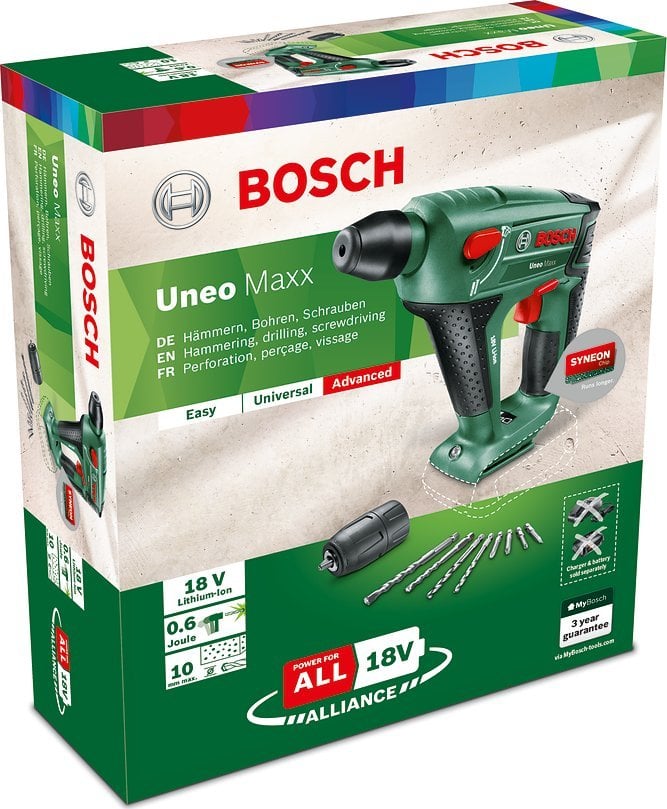 Акумуляторний перфоратор Uneo Maxx Оптимальний акумуляторний інструмент 3-в-1 для складної роботи. Пневматичний ударний механізм забезпечує легке та швидке свердління, а також у бетоні Патрон SDS забезпечує інтуїтивно зрозумілу та просту заміну аксесуарів протягом 3 секунд Компактний інструмент високої потужності для оптимальної роботи та ефективності Для ударного свердління, свердління та загвинчування бетону, цегляної кладки, металу, дерева та керамічної плитки POWER ДЛЯ ВСІХ: один акумулятор і один зарядний пристрій для роботи з усіма електроінструментами з пропозиції «Дім і сад».Ефективний, компактний і бездротовий інструмент 3-в-1 для складної роботи з будь-яким матеріалом. Ефективний і компактний акумуляторний перфоратор Uneo Maxx 3-в-1 був розроблений для найскладніших робіт, пов’язаних з ударним свердлінням, свердлінням і загвинчуванням бетону, цегли, металу, дерева та керамічної плитки.Пневматичний ударний механізм Bosch і потужний двигун дозволяють легко і швидко свердлити отвори діаметром до 10 мм в бетоні. Інструмент має тримач SDS, який забезпечує інтуїтивно зрозуміле керування та швидку заміну аксесуарів за допомогою шестигранного хвостовика 1/4″ і SDS quick протягом 3 секунд. Цей легкий (1,4 кг), компактний та ефективний інструмент забезпечує комфортну роботу у важкодоступних місцях, легко справляючись із будь-яким проектом: від свердління бетону до точного загвинчування деревини. Інструмент є частиною POWER FOR ALL ALLIANCE. Одну батарею можна використовувати для POWER FOR ALL – для всіх акумуляторних систем Bosch POWER FOR ALL можна використовувати в різноманітних інструментах, що забезпечує більшу гнучкість роботи Перемикач функцій забезпечує універсальність трьох інструментів в одному режимі, від точного свердління на високій швидкості до легкого свердління в бетоні. (свердління, свердління, загвинчування) та інтуїтивно зрозуміла заміна аксесуарів за допомогою шестигранного хвостовика 1/4″ і швидкого хвостовика SDS за 3 секунди.Адаптер для свердел з циліндричним хвостовиком Адаптер для патрона дозволяє використовувати стандартні свердла з циліндричним хвостовиком і інтуїтивно зрозумілий і простий спосіб кріплення адаптера на патроні та встановлення аксесуарів.Технологія Syneon: довший час роботи Технологія Syneon забезпечує оптимальну потужність для складної роботи та подовжує час роботи для менш інтенсивної роботи.