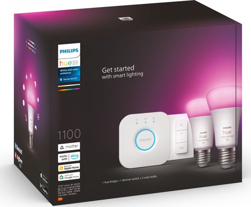 Просте у використанні розумне освітлення Створіть унікальну барвисту атмосферу в будь-якій кімнаті за допомогою стартового набору Philips Hue White і Color Ambiance з лампочками E27.Після підключення до мосту Hue, що входить у комплект, ви можете використовувати необмежену кількість функцій.Керуйте освітленням за допомогою програми, голосу або розумних перемикачів.• Підвищуйте настрій • Розважайтеся з розумним кольоровим освітленням • Керуйте освітленням поза домом • Синхронізуйте фільми, телешоу, музику та ігри за допомогою розумного освітлення • Бездротове керування
