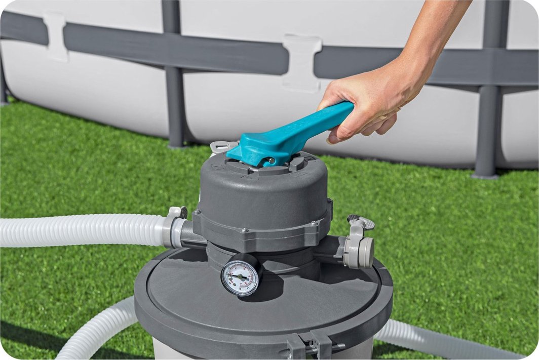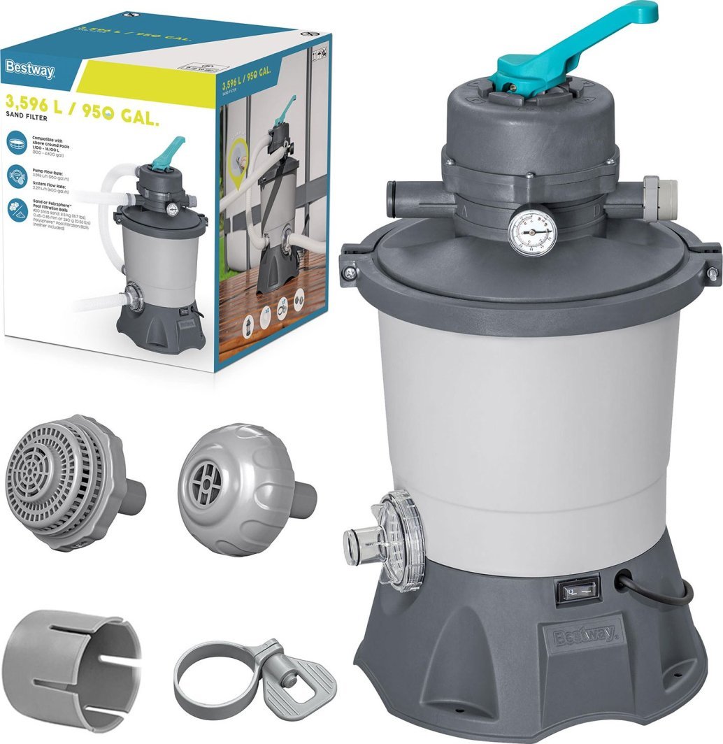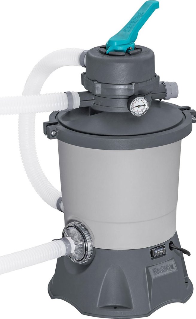 Пісочний насос для басейнів 3596 л/год BESTWAY 58515 ★★★ Чиста вода без зусиль ★★★ Пісочні насоси є одним з найефективніших пристроїв для очищення води в садовому басейні.Порівняно зі звичайними паперовими фільтрами вони не мають собі рівних – пісок має більший термін експлуатації, а сам процес очищення багатоступеневий.Модель призначена для басейнів об’ємом 1000-18100 л. Основні характеристики: ефективна фільтрація води, антикорозійний бак, регулюючий клапан, який легко зчитується, манометр, простий у використанні, верхній хомут забезпечує обертання на 360 градусів, у комплекті дозатор таблеток, попередній фільтр для відділення листя та інших забруднень, 6-позиційний клапан, що дозволяє легко контролювати фільтр. вага: 8,50 кг необхідний картридж: #20 кремнеземний пісок 0,45-0,85 мм Ємність резервуара: прибл. 7,86 кг сертифікати: CE