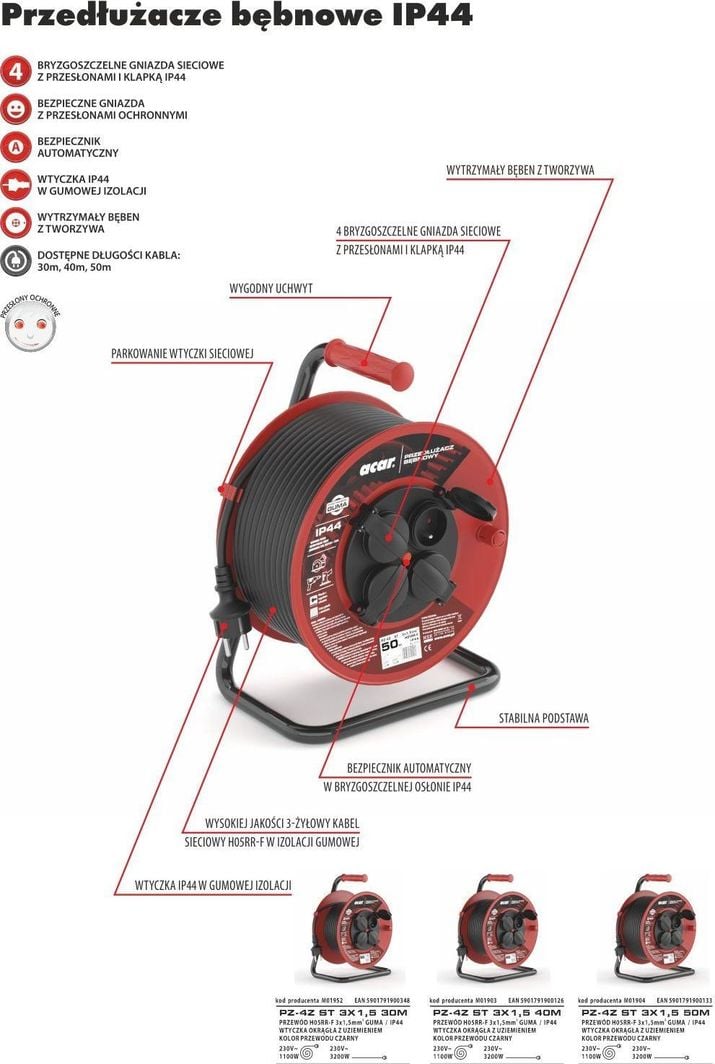 Час роботи: немає Довжина кабелю [м]: 30.00 Додаткова інформація: Кабель: H05RR-F 3×1.5mm2 ГУМА / IP44 IP44 штекерна гумова ізоляція Допустиме навантаження згорнутого кабелю: 1100 Вт Допустиме навантаження розгорнутого кабелю: 3200 Вт Колір кабелю: Чорний Колір корпусу: Червоний (Red) Номінальна напруга: 230 В. 50 Гц Загальний опис: Подовжувач барабана Acar M01952, 30 м, чорний