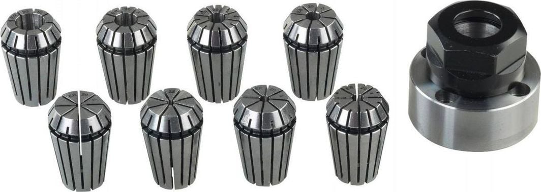 Набір патронів із патронами ER 20: забезпечує надзвичайно високу коаксіальну точність.2 – 10 мм (DIN ISO 15488).Для дуже точної обробки круглих деталей.Тримачі встановлюються замість токарного патрона.8 тримачів (2 – 2,5 – 3 – 4 – 5 – 6 – 8 і 10 мм).Упакований в дерев’яний ящик.