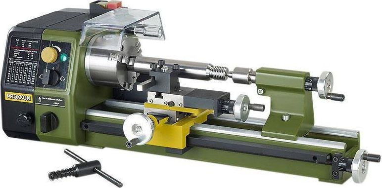 Для поперечного, поздовжнього, конічного точіння та нарізання різьби.Для роботи з латунню, алюмінієм і пластиком.З фланцем для кріплення фрезерної головки. Відстань між центрами: 250 мм.Поперечна подача 70 мм.Висота над хрестовиною 43 мм.Ліжко: Чавунне з широким проміжком і призматичними полозками.Робота без вібрації навіть при високих навантаженнях. Задній фланець для кріплення фрезерно-токарної головки PF 230. Покритий напрямний шпиндель.Головна бабка: виготовлена ​​з литого під тиском алюмінію.Головний шпиндель на прецизійних підшипниках (бій без ручки 1/100 мм) з отвором 10,5 мм.Діаметр з боку ручки 70 мм, внутрішній отвір 14 мм.Вал з отвором МК 2. Поворотний перемикач, що дозволяє автоматичну подачу за допомогою направляючого шпинделя та ходового гвинта (опціонально 0,05 або 0,1 мм на оберт).Задня бабка: виготовлена ​​з литого алюмінію.Гільза Ø 20 мм, розтягується до 30 мм.З міліметровою шкалою, отвором MK 1 і токарним центром.Підтримка: литі санчата. Привід: Тихий спеціальний двигун постійного струму з триступеневою пасовою передачею, що дозволяє вибрати швидкість 300–900 і 3000 об/хв.Додаткове регулювання швидкості (повнохвильова електроніка) з плавною зміною швидкості від 100 до 300 і 1000 об/хв.в залежності від передавального числа.Права і ліва передача.Головний вимикач із функцією захисного вимикача та захистом від перезапуску.Токарний патрон: високоякісний трикулачний токарний патрон відповідно до DIN 8386, клас 1 (допуск концентричності: 0,04 мм).Розмірний ряд заготовок: від 2 до 75 мм завдяки можливості зворотного монтажу губок.У комплект входить кришка токарного патрона з запобіжним вимикачем.Ручки: виготовлені з алюмінію, з регульованою шкалою (1 поділка = 0,05 мм, 1 поворот = 1 мм).Інструмент для нарізання різьби: зі змінними шестернями, що дозволяє нарізати праву та ліву метричну різьбу з найбільш часто використовуваним кроком (0,5 – 0,625 – 0,7 – 0,75 – 0,8 – 1 – 1,25 – 1,5 мм).Інші технічні дані: 230В.50/60 Гц.довжина 560 мм ширина 270 мм висота 170 мм.Вага прибл. 12 кг.Proxxon, родом з Німеччини, є провідним виробником чудових гайкових ключів і професійних мікроінструментів.Пропозиція досвідченої компанії включає, серед іншого, високоякісні токарні верстати, лобзики, свердлильні та фрезерні верстати та мікрофрезерні верстати.Технологічно передові інструменти Proxxon використовуються в механіці, електроніці, протезуванні та ювелірній справі.Їх цінують як професіонали, моделісти, так і ентузіасти DIY.