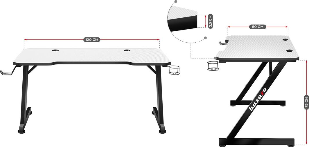 Ігровий стіл Huzaro Hero 2.5 Вражаючий дизайн і надзвичайно практичні рішення Тримачі для навушників і чашок Корпус столу покритий міцним матеріалом Carbon Товста, надзвичайно міцна верхня частина із заокругленими краями Два спеціальних кабельних вводу Стійка рама, алюмінієва конструкція та посилені ніжки Регульовані ніжки Стільниця з покриттям Carbon Flex Стільниця покрита спеціальним покриттям, схожим на карбон.Це надзвичайно практичне рішення, стільниця міцна, стійка до подряпин і забруднень і при цьому чудово виглядає.Непорушна стільниця!Стільниця товщиною 25 мм, виготовлена ​​з міцної плити HDF PVC, забезпечує довговічність і стабільність навіть під дуже високим тиском.2 кабельні вводи Ігровий стіл має два кабельні вводи.Входи встановлені з обох боків столу, тому незалежно від установки ваша ігрова станція завжди буде охайною.Тримач для навушників Зручний і зручний тримач для навушників.Коли ви не використовуєте навушники, вони надійно висять, не займаючи місця на столі.Тримач можна швидко і зручно заховати під стіл.Складний тримач для чашок Спеціальний зручний тримач для напоїв.У ній можна легко і безпечно зберігати банки, пляшки та стакани.Таке рішення дозволить уникнути затоплення обладнання.Тримач можна легко і швидко скласти і заховати під стіл.Виробник: Huzaro Модель: Hero 2.5 Стільниця: 120 см х 60 см Товщина стільниці: 25 мм Висота від підлоги до стільниці: 75 см Тримачі: для навушників, для напоїв Посилена конструкція Ніжки: регульовані