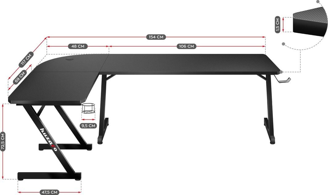 Ігровий стіл Huzaro Hero 7.0 чорний Huzaro Hero 7.0 Corner Gaming Desk Привабливий дизайн і надзвичайно практичні рішення Корпус столу, покритий міцним вуглецевим матеріалом Товста, надзвичайно міцна верхня частина із заокругленими краями Універсальний кабельний ввід Стійка рама, алюмінієва конструкція та посилені ніжки Гнучка збірка (ліворуч або праворуч) Регульовані ніжки Функції та переваги ПОКРИТИЙ ВЕРХ CARBON FLEX Стільниця покрита спеціальним карбоновим покриттям.Це надзвичайно практичне рішення, стільниця міцна, стійка до подряпин і забруднень і при цьому чудово виглядає.НЕЗНИЩЕННИЙ ВЕРХ!Стільниця товщиною 15 мм з міцної дошки забезпечує довговічність і стійкість навіть під дуже високим тиском.ЦЕНТРАЛЬНО РОЗТАШОВАНИЙ КАБЕЛЬНИЙ ВВОД На столі є стратегічно розташований кабельний ввід.Встановивши її в самому центрі меблів, ви зможете розташувати станцію по обидва боки найбільш зручним способом.ТРИМАЧ ДЛЯ НАВУШНИКІВ Зручний, зручний тримач для навушників.Коли ви не використовуєте навушники, вони надійно висять, не займаючи місця на стільниці.Тримач можна швидко і зручно заховати під стіл.СКЛАДНИЙ ПІДСТАКНИК Спеціальний зручний тримач для напоїв.У ній можна легко і безпечно зберігати банки, пляшки та стакани.Таке рішення дозволить уникнути затоплення обладнання.Тримач можна легко і швидко скласти і заховати під стіл.