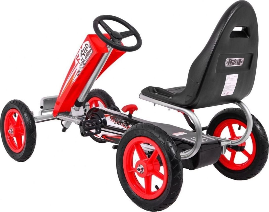 Специфікація Gokart Full Ahead [F8-1] Привід: ланцюговий привід (повний корпус), металеві шестерні, ручне гальмо на обох колесах, передача для руху вперед/назад і вільна передача, Колеса: пневматичні гумові колеса, всі колеса з шарикопідшипниками, ø 32 см x 5,5 см, Сидіння Профільоване спортивне сидіння з двоступеневим регулюванням, 35 см x 21 см x 36 см, Розміри Розмір Автомобіль Довжина 122 см, Ширина 57 см, Висота 73 см, Максимальне навантаження 50 кг, Вага автомобіля 14 кг, Розмір коробки 89 х 62 х 40 см, Вага в коробці 16 кг, Дорожній просвіт 11 см, Додаткове обладнання Інструкція Монтажний комплект