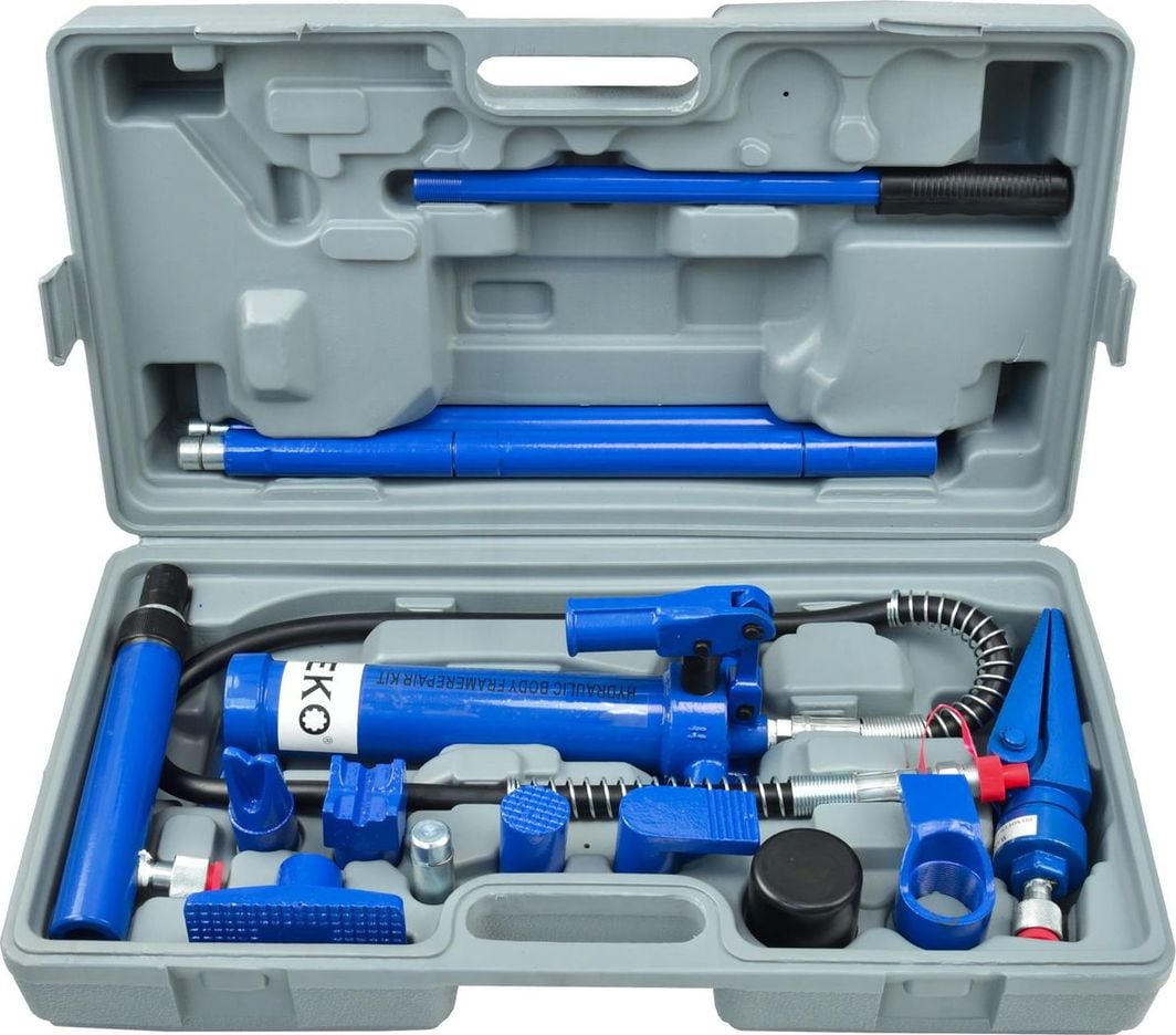 Гідравлічний розкидач Geko 4т (G02074) Гідравлічний розкидач призначений для роботи в майстерні.Пристрій, призначений для підйому, розтягування, розправлення, згинання, випрямлення та витягування. Набір поміщений в транспортний кейс.Сила натискання 4T, хід поршня: 125 мм Максимальний хід поршня: 125 мм (використання подовжувачів збільшує хід) Гідравлічний шланг: перед запуском насоса перевірте всі з’єднання, за необхідності підтягніть.УВАГА!!!Не пошкодити нитки!!!Якщо ви помітили пошкодження шланга, негайно припиніть роботу та відпустіть вентиль, зменшивши тиск.Не зупиняйте витоки, високий тиск може спричинити серйозні травми.Захищайте кабель від вогню, надзвичайно високих або низьких температур, гострих країв і високого тиску.Не допускайте, щоб шланг перегинався, згинався або розчавлювався.Рідина повинна текти вільно.Не тягніть за шнур, перевірте стан шнура.Матеріал кабелю і роз’ємів призначений для роботи з гідравлічною рідиною.Однак матеріал кабелю слід захистити від агресивних хімічних речовин і деяких лаків.Перед фарбуванням кабелю перевірте лак на агресивність.НІКОЛИ не фарбуйте стики.Деякі елементи комплекту не пристосовані до максимальних навантажень.Подробиці описані в пункті «Способи роботи і навантаження».Насос і привод: НІКОЛИ не перевищуйте допустимі навантаження!!!Це може призвести до серйозних травм.Щоб долити гідравлічну рідину, втягніть поршневий шток приводу якомога далі та долийте рідину через вентиляційний отвір у корпусі насоса.Насос може працювати як в горизонтальному, так і у вертикальному положенні.Використовуючи подовжувачі, завжди пам’ятайте про розміщення найкоротшого подовжувача зовні набору.Насос оснащений перевантажувальним клапаном, який повертає масло назад у бак насоса, якщо набір знаходиться під максимальним навантаженням.У такій ситуації подальше прокачування не дасть ефекту.Якщо така ситуація повторюється, використовуйте набір більшого тоннажу.Методи роботи та навантаження: Загальне правило полягає в тому, що кожні два подовжувачі, які використовуються в збірці, зменшують навантаження на 50%.А кожне додаткове розширення зменшує навантаження вдвічі.УВАГА!!!Переконайтеся, що найкоротші подовжувачі завжди знаходяться якомога далі від приводу.