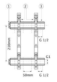 Розподільник латунний RP 10-ходовий 1″ R022801009 розподільна балка 10-ходовий 1″, 2 шт. набір сталевих ручок, заглушка G1, 2 шт. відстань між отворами 50 мм, ручки з листового металу товщиною 4 мм
