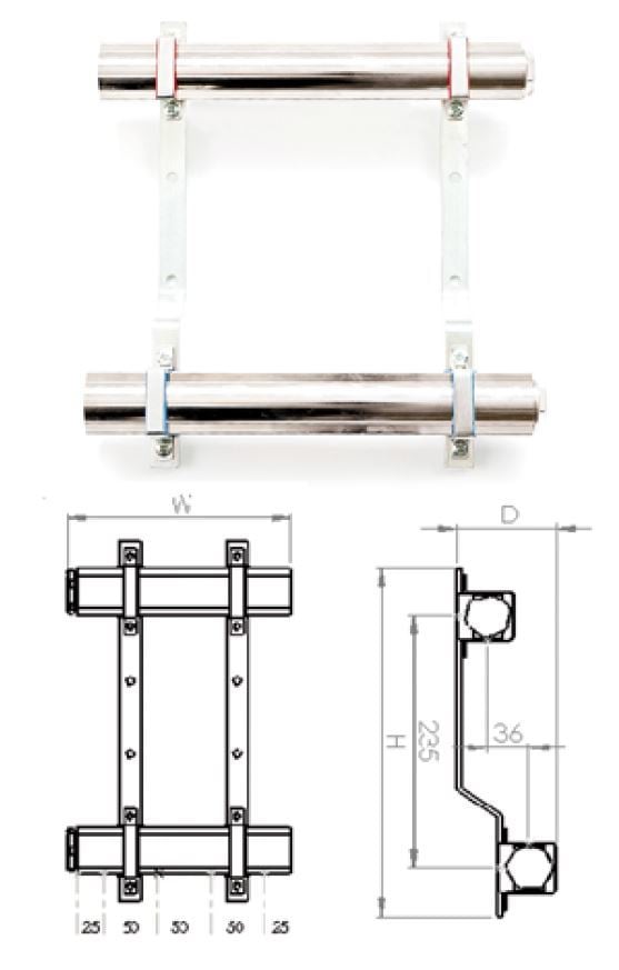 Латунний розподільник 359x325x87 мм – RM-7 Ширина W: 359 мм Висота H: 325 мм Глибина D: 87 мм Кількість контурів: 7 Нікелева латунна балка x2 з G1/2″ Нікелева латунна заглушка G1″ Оцинкована сталь x2
