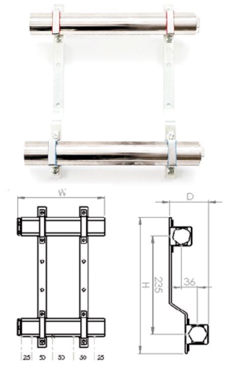 Латунний розподільник 409x325x87 мм – RM-8 Кількість контурів: 8 Ширина Ш: 409 мм Висота В: 325 мм Глибина D: 87 мм Нікелева латунна балка x2 G1/2″ Нікелева латунна заглушка G1″ Оцинкована сталева скоба x2