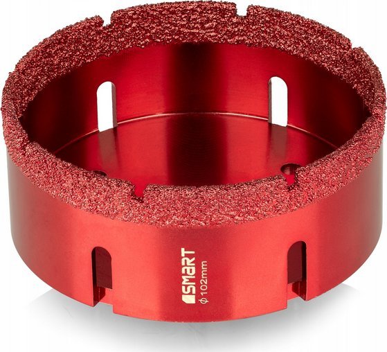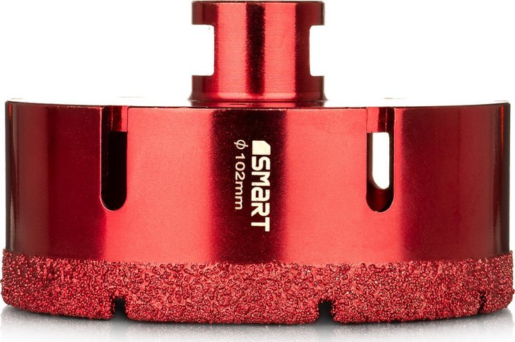 SMART365 SM-25-1020 Алмазна діркова пила 102 мм Абразивна поверхня з алмазів, наплавлених методом вакуумної пайки.Підходить для сухої роботи.Свердла та діркові пилки можуть робити отвори глибиною до 35 мм. Кріплення на різьбі М14 дозволяє працювати безпосередньо на кутових шліфувальних машинах з максимальною швидкістю обертання до 12 000/хв або шліфувальних машинах з регулюванням обертів.Кольцєві пилки діаметром 20-75 мм дозволяють точно свердлити отвори для гідравлічних з’єднань, дренажів, електричних коробок і вмонтованого освітлення.Бічні отвори в бітах 20-75 мм забезпечують краще охолодження та полегшують видалення брусу.Рекомендується виконувати кругові рухи для кращого охолодження і продовження терміну служби свердел.Технічні дані: Діаметр: 102 мм Максимальна глибина свердління: 35 мм Патрон: M14 – для кутових шліфувальних машин Максимальна швидкість обертання: 12 000 об/хв Висота алмазного покриття: 10 мм Застосування: Сухе