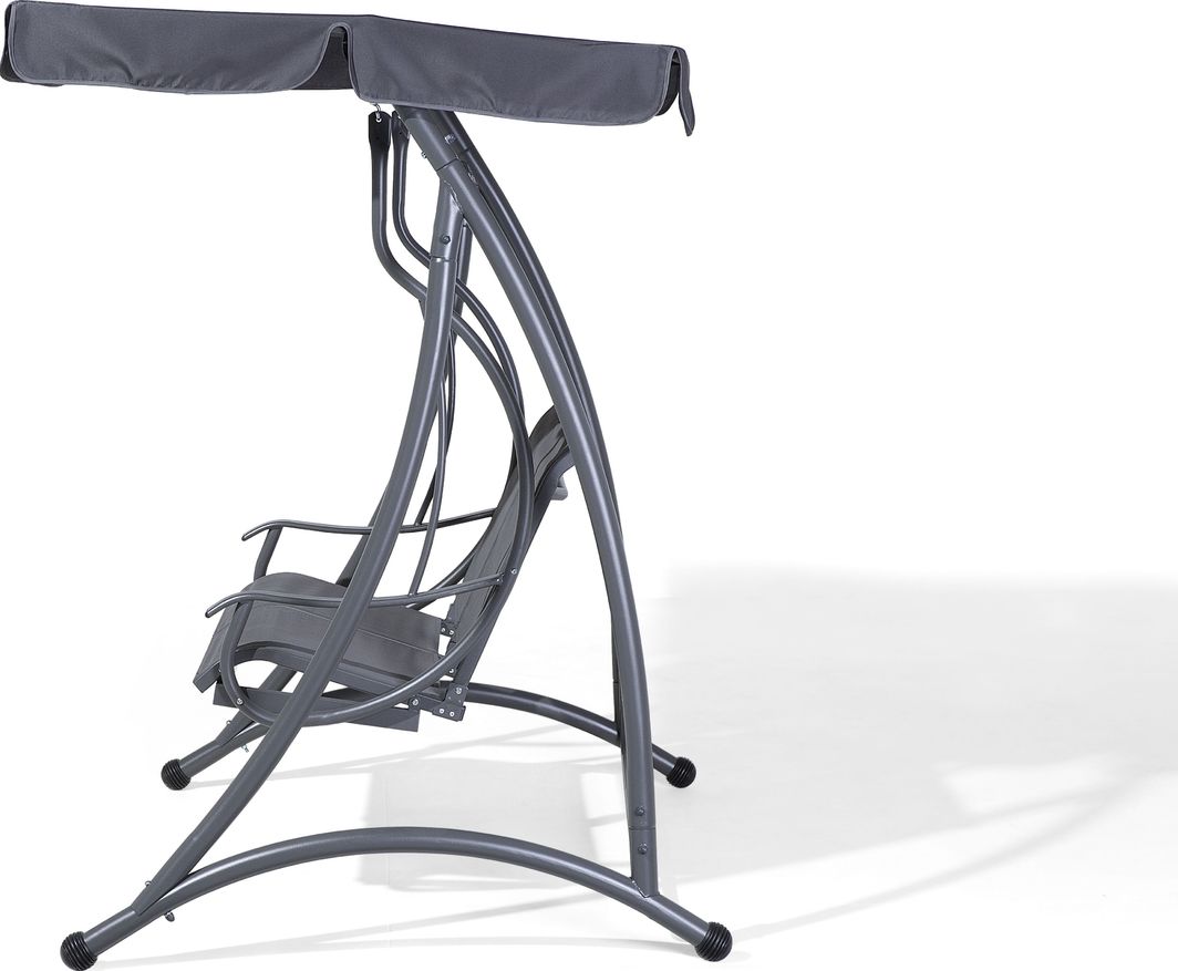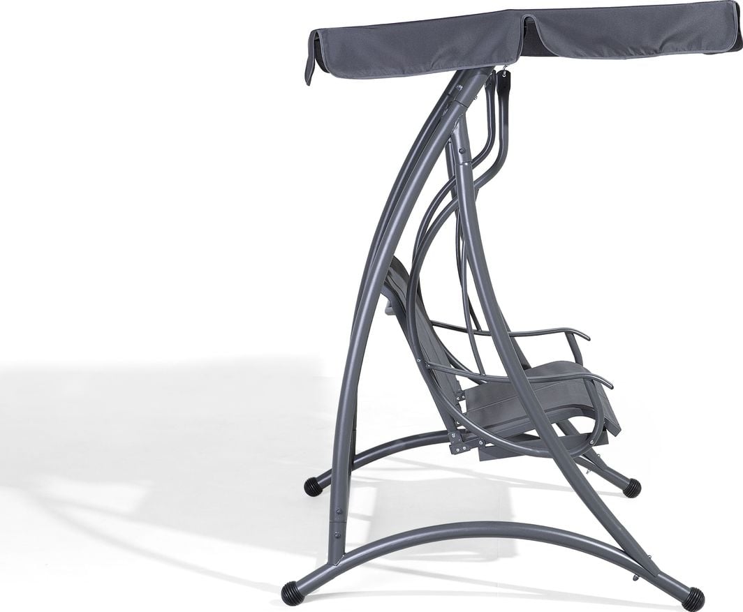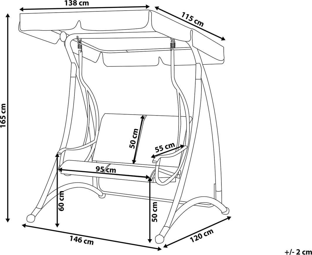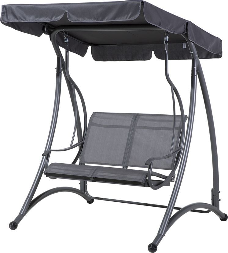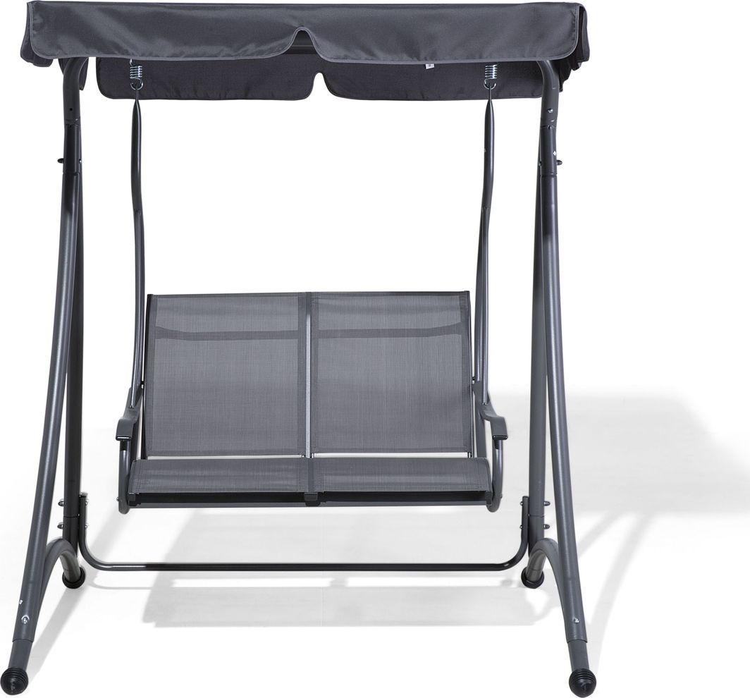 Зручні і декоративні двомісні садові гойдалки – це романтичне рішення для Вашого саду.Поєднання сталевої рами з міцним тканинним сидінням і дахом є гарантією довговічності та стійкості.Вбудований регульований сонцезахисний козирок із сірого міцного поліестеру захищає від сонячного світла.Висота: 165 Ширина: 146 Глибина: 120 Вага: 41,5 Висота сидіння: 50 Площа сидіння: 95×55 Матеріал: Сталь