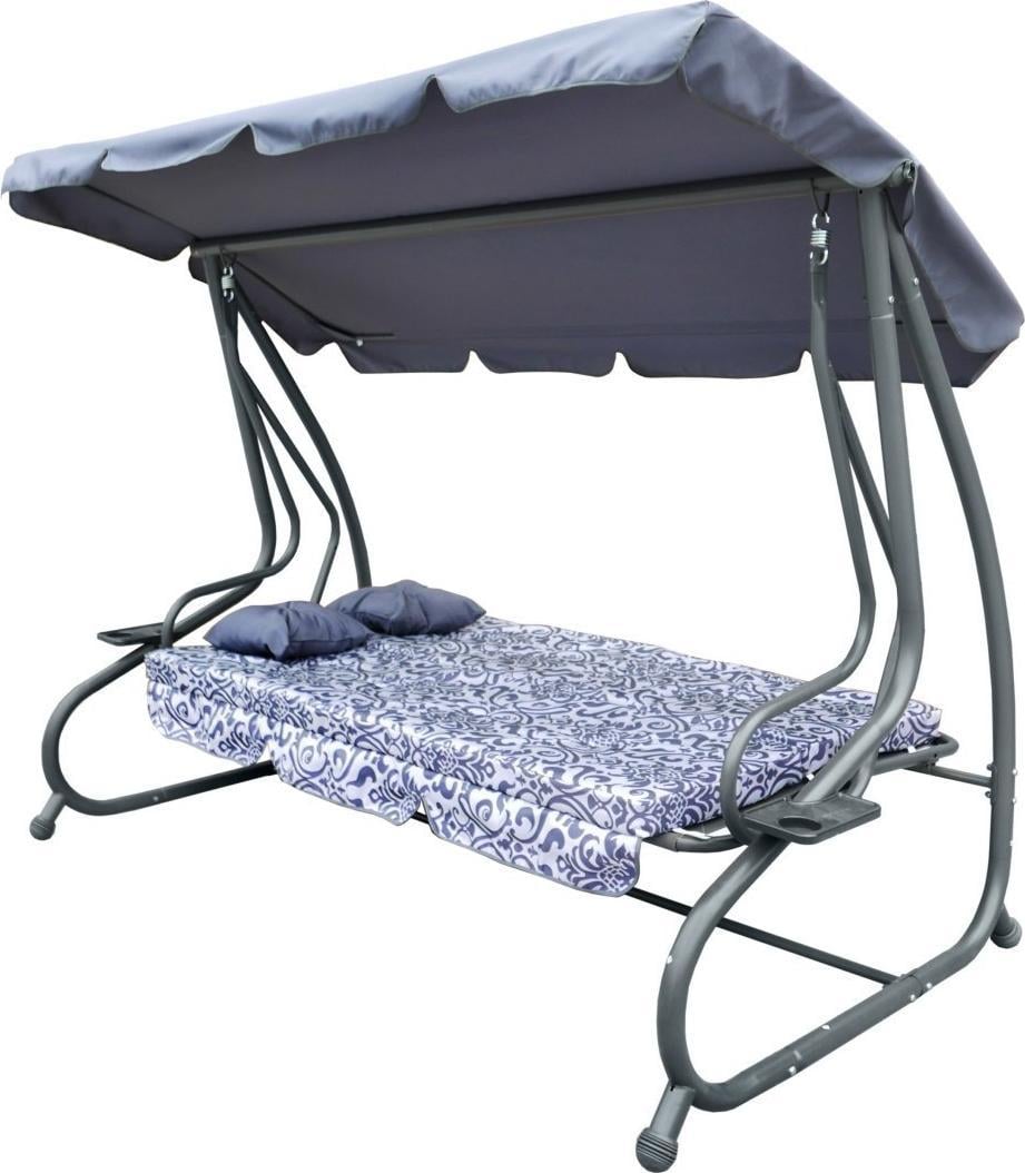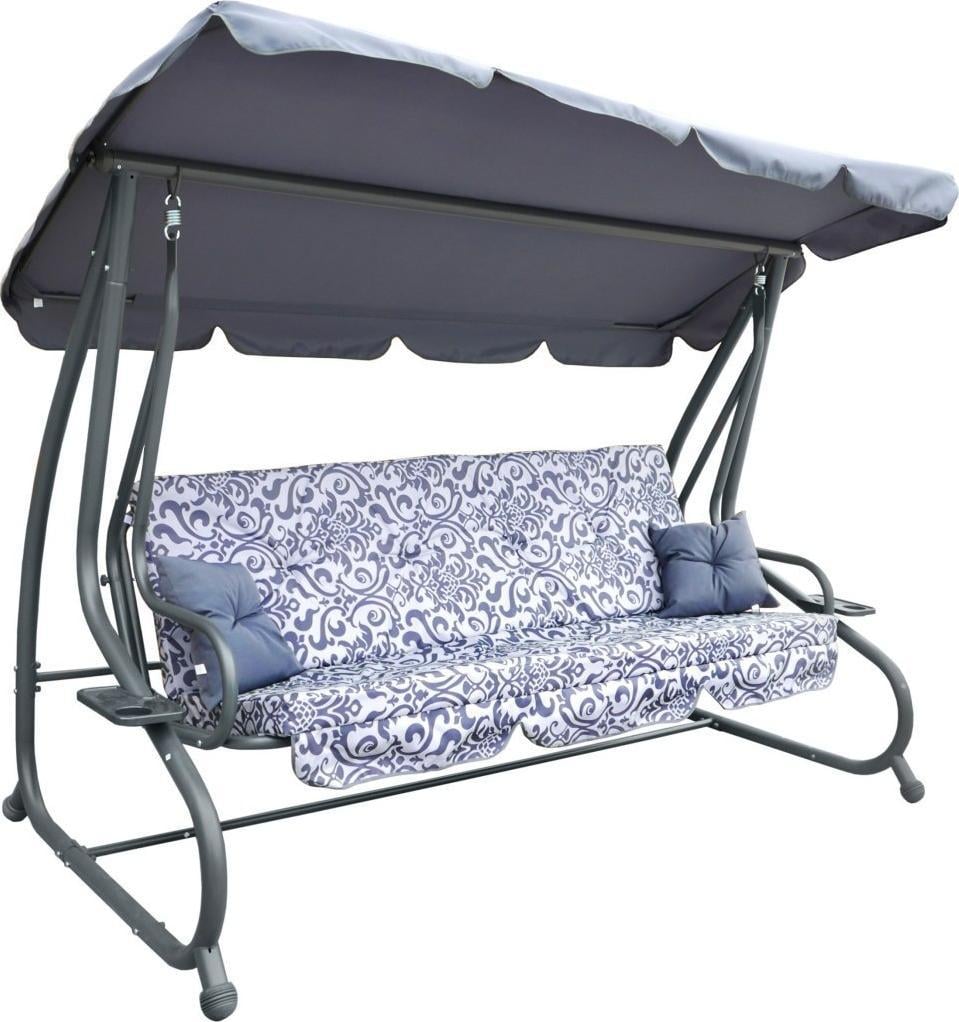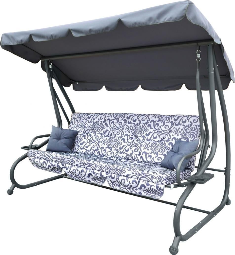 Опис Садові гойдалки зі складаним сидінням і регульованим навісом, сірі з візерунком [8011 PATTERN SZ] Сидіння виготовлено з матеріалу Textiline з переплетенням 2х1. Матеріал, з якого виготовлена сітка, – поліефірна пряжа, покрита вінілом.Textiline призначений для зовнішнього використання завдяки високій стійкості до суворих погодних умов.Сітка надзвичайно гнучка і стійка до розтягування, що додатково впливає на комфорт використання, а сам матеріал не деформується.2 стьобані подушки та матрац для сидіння (губка для оббивки 10 см), багатоступінчасте, плавне регулювання купалу, чохол на балдахін з поліестеру щільністю 180 г, зручне розкладне сидіння, яке можна використовувати як для сидіння, так і для лежання, 2 підставки для напоїв, кріплення гойдалок на пружинах, конструкція зі сталі з порошковим покриттям, якісні зварні шви, висока стійкість до погодних умов, масивна нековзна гума на кінцях ніжок, дуже легко підтримувати в чистоті, чохол на сидіння з поліестеру вагою 160 г, максимальне навантаження 300 кг., Розміри Зовнішні розміри ширина прибл. 214 см, глибина бл. 114 см, висота плафону в центральній частині бл. 168 см, вага прибл. 39 кг, висота спинки сидіння без матраца прибл. 50 см, глибина сидіння без матраца бл. 48 см, довжина сидіння без рами прибл. 185 см, ширина сидіння в розкладеному вигляді прибл. 100 см, довжина купола прибл. 220 см, ширина бл. 117 см, довжина матраца прибл. 180 см, сидіння бл. 48 см, спинка прибл. 51 см, ширина в розкладеному вигляді прибл. 101 см, розмір упаковки 207 х 57 х 30 см, вага 41 кг, товщина трубок для ніжок рами 48 х 1,1 мм, верхньої рами 48 х 1,1 мм, рами сидіння 32 х 1,2 мм, посилення гойдалок 25 х 0,8 мм, рами сидіння 28 х 1,5 мм, рами навісу 16 х 0,6 мм,
