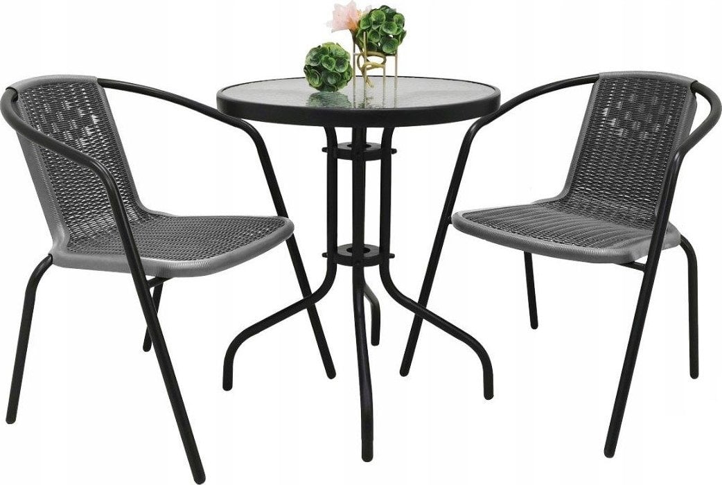 Садовий кавовий набір для тераси на 2 особи, стіл і стільці, сірий, 2x стілець LORETTO, сірий – 5901386273031 Стіл BERGAMO, fi 60, чорний – 5901386272843 Зручний, сучасний набір садових меблів, що складається зі столу і зручних стільців.Ідеально підходить для саду, ділянки або тераси.Він був створений з урахуванням найвибагливіших клієнтів.Високий комфорт використання, найвища якість використаних матеріалів і надзвичайно елегантний зовнішній вигляд.Технічні характеристики крісла Loretto: – Ширина: 55 см – Глибина: 59 см – Висота: 73 см – Вага: 2,8 кг – Призначення: використання в приміщенні та на вулиці – Матеріал: каркас: сталь;сидіння: пластик (пластик, що імітує ротанг) – Обробка: сталь з порошковим покриттям – Функції: не регулюється – Догляд: не потребує обслуговування, легко миється – Інструкція по збірці: не вимагає загвинчування – Штабелируемая: так – Максимальне навантаження: 120 кг Специфікація столу BERGAMO fi60: – Практичний стіл для саду, тераси або балкону – Стільниця з міцного загартованого скла з візерунком, що брижіє водою – Сталеві профілі з порошковим покриттям – Стільниця без отвору – Підходить для зовнішнього та внутрішнього використання – Легкий монтаж – Розмір стільниці fi: 60 см – Висота: 70 см