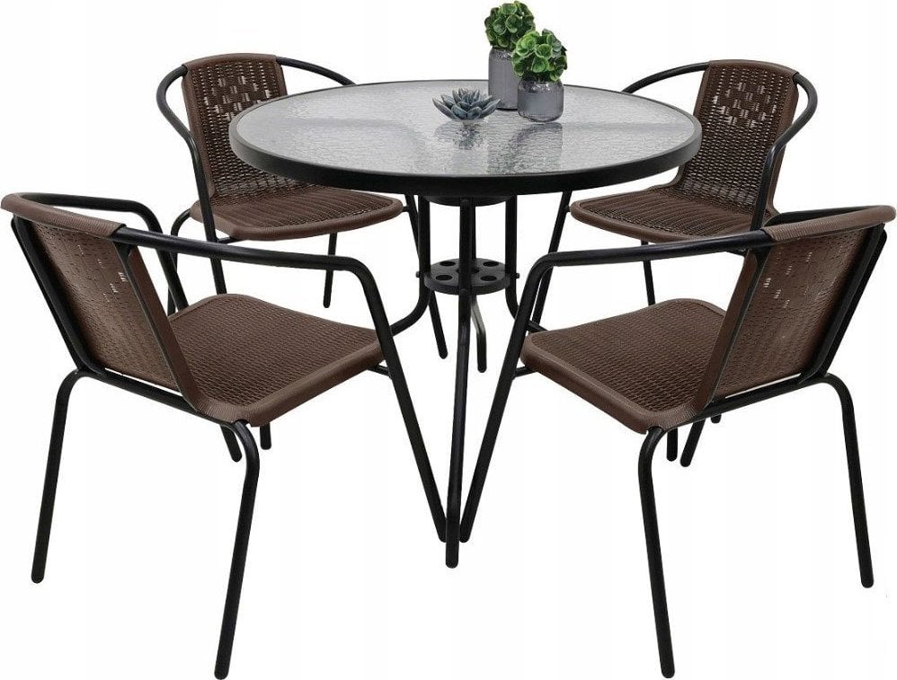 Садовий кавовий набір для тераси на 4 персони, стіл і стільці коричневий, 4x стілець LORETTO коричневий – 5901386273024 Стіл BERGAMO fi 90 чорний – 5901386272812 Зручний, сучасний комплект садових меблів, що складається зі столу і зручних стільців.Ідеально підходить для саду, ділянки або тераси.Він був створений з урахуванням найвибагливіших клієнтів.Високий комфорт використання, найвища якість використаних матеріалів і надзвичайно елегантний зовнішній вигляд.Технічні характеристики крісла Loretto: – Ширина: 55 см – Глибина: 59 см – Висота: 73 см – Вага: 2,8 кг – Призначення: використання в приміщенні та на вулиці – Матеріал: каркас: сталь;сидіння: пластик (пластик, що імітує ротанг) – Обробка: сталь з порошковим покриттям – Функції: не регулюється – Догляд: не потребує обслуговування, легко очищається – Інструкція зі складання: не вимагає загвинчування – Штабелируемая: так – Максимальне навантаження: 120 кг Специфікація столу BERGAMO fi90: – Практичний стіл для саду, тераси або балкону – Стільниця з міцного загартованого скла з візерунком, що хвилює воду – Сталеві профілі з порошковим покриттям – Стільниця без отвору – Підходить для зовнішнього та внутрішнього використання – Легка установка – Розмір стільниці fi: 90 см – Висота: 70 см