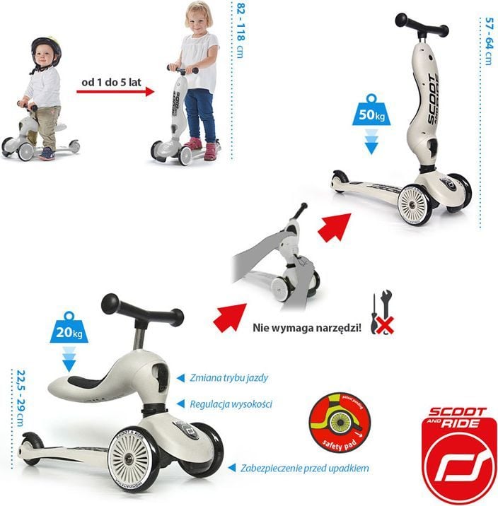 Вишуканий у кожній деталі Highwaykick 1 — інноваційний самокат із сидінням від австрійського бренду SCOOT&RIDE.Це ідеальне рішення для активних дітей, до того ж воно «росте» разом з ними. Воно росте разом з дитиною.Висота сидіння регулюється, а його найнижче положення адаптовано до росту малюка, який робить перші кроки, і становить 22,5 см. Трансформація без інструментів Без інструментів, лише однією кнопкою ви можете перетворити транспортний засіб на скутер на 3 колесах за кілька секунд – поворотне сидіння стає його передньою рамою.Просто порухайте кермом (встановлюється клацанням) і все!Тепер старший також може розпочати свою розкидану пригоду.Безпека Скутер ідеально збалансований і стійкий, зручний і надзвичайно безпечний.Він оснащений запатентованою революційною системою Safety-Pad – спеціальною широкою накладкою, розташованою внизу передньої частини, яка запобігає, зокрема, перекиданню на нерівній місцевості або застряганню коліс.При необхідності його положення також можна відрегулювати.Scoot & Ride Highwaykick стане товаришем по грі вашої дитини на довгі роки.Найважливіші особливості Scoot & Ride Highwaykick 1: швидкий механізм зміни функцій без використання інструментів два передніх колеса з дуже міцного, амортизаційного матеріалу, що забезпечує стабільність і комфорт водіння, заднє колесо з бризковиком і простим у використанні гальмом, зручне, м’яке, профільоване сидіння, неслизька платформа, зручне кріплення керма, сталевий каркас керма і зручні ручки, які запобігають ковзанню ручок, міцна конструкція, міцна, міцний поліпропіленовий каркас, система безпеки, відсутність гострих країв і кутів, небезпечних для дітей, привабливий, стильний дизайн, включаючи: міцний логотип на передній частині та підписані колеса самоката Highwaykick 1 доступні у 8 кольорах: соковиті, фруктові кольори з колекції IceCream: синій (Bluberry), оранжево-рожевий (Peach), жовтий (Lemon) і зелений (Kiwi) і пастельний кольори: кремово-сірий (Ash), світло-рожевий (Rose), сіро-блакитний (Steel) і темно-зелений (Forest) Scoot & Ride Highwaykick Технічні характеристики 1: рекомендований вік дитини: 1 – 5 років рекомендований зріст дитини: 82 – 118 см максимальне навантаження: 20 кг на сидіння і 50 кг з протектором Вага продукту: 2,8 кг регулювання висоти керма: 57 – 64 см Регулювання висоти сидіння: 22,5 – 29 см Матеріал: алюміній і пластик Scoot & Ride Highwaykick 1 був створений відповідно до строгих міжнародних норм безпеки та стандартів якості.Він упакований в картонну коробку, тому чудово підходить як подарунок.