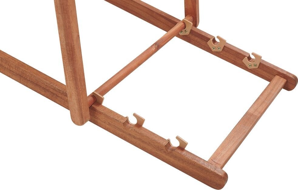 Відкидний пляжний шезлонг зі змінними тканинами.Цей пляжний шезлонг розроблено з любов’ю до традиційного стилю.Завдяки малій вазі та складності ви можете легко використовувати його в саду, а також взяти з собою на пляж чи влаштувати пікнік у парку.Шезлонг виготовлено з деревини акації та міцного білого поліестеру, що гарантує довговічність протягом багатьох років.Також до складу товару входять дві змінні тканини з модним малюнком.Деталі: Тип виробу: Шезлонг Стиль: Скандинавський Основний колір: Коричневий Колір рами: Темне дерево Абажур: Близько-білий Тип матеріалу: Дерево Матеріал: Тканина Склад матеріалу: 100% поліестер Регульована спинка: Так Регульовані частини: Спинка Підлокітники: Ні Оздоблення: Змащений Складний: Так Розміри: Глибина: 97/99/101 см Висота сидіння: 29 см Ширина: 54 см Висота: 70/76/84 см Вага: 6 кг Макс. навантаження: 120 кг Пропозиція: 1 х Садовий шезлонг, 1 х Змінна тканина, 2 х Змінна тканина (модель на вибір) Характеристики продукту: Змінна тканина спинки включена, 3-ступеневе регулювання спинки, Ідеальне місце для відпочинку, Традиційний дизайн з відтінком сучасності, Стійкість тканини до впливу сонячних променів – клас 4 (ISO 105-B05), Міцна та міцна конструкція, Для підтримки високої якості, виріб повинен бути захищений від води та дощу, можливість зберігання завдяки функції складання. Збірка: Частково зібрана.5-15 хв.Додаткова інформація: продукт, наведений нижче, постачається з детальною інструкцією з догляду, завдяки якій меблі будуть виглядати якнайкраще протягом багатьох років.Ознайомтеся з інструкціями з обслуговування та порадами щодо правильного догляду за вашим новим виробом – ви знайдете їх у розділі «Упаковка та збірка» нижче.Стійкість: вологостійкість означає, що цей продукт не пошкодить невелика кількість води чи інших рідин.Ви можете вільно використовувати його на вулиці, навіть під час невеликого дощу або вологого повітря.Однак сильний дощ або велика кількість води можуть завдати шкоди.Щоб забезпечити найкращий зовнішній вигляд і функціональність, ми рекомендуємо зберігати виріб у сухому закритому приміщенні або під кришкою, коли він не використовується.Стійкість до вологи Інструкції з догляду: Деревина акації: 1. Для чищення використовуйте лише м’які мийні засоби та м’яку тканину, протираючи поверхню в напрямку волокон.Після вологого протирання ретельно витріть насухо. 2. Дерево з промасленим покриттям слід змастити маслом перед використанням і знову після сезону, особливо у вологому кліматі. 3. Поза сезоном і під час несприятливих погодних умов рекомендується зберігати продукт під брезентом або в сухому та прохолодному приміщенні.Тканина: 1. Лише ручне прання в холодній воді з м’яким миючим засобом правою стороною назовні із закритою блискавкою. 2. Не сушити в пральній машині і не прасувати. 3. Якщо текстиль не використовується, його слід захистити від несприятливих погодних умов і зберігати в чистому та сухому приміщенні.