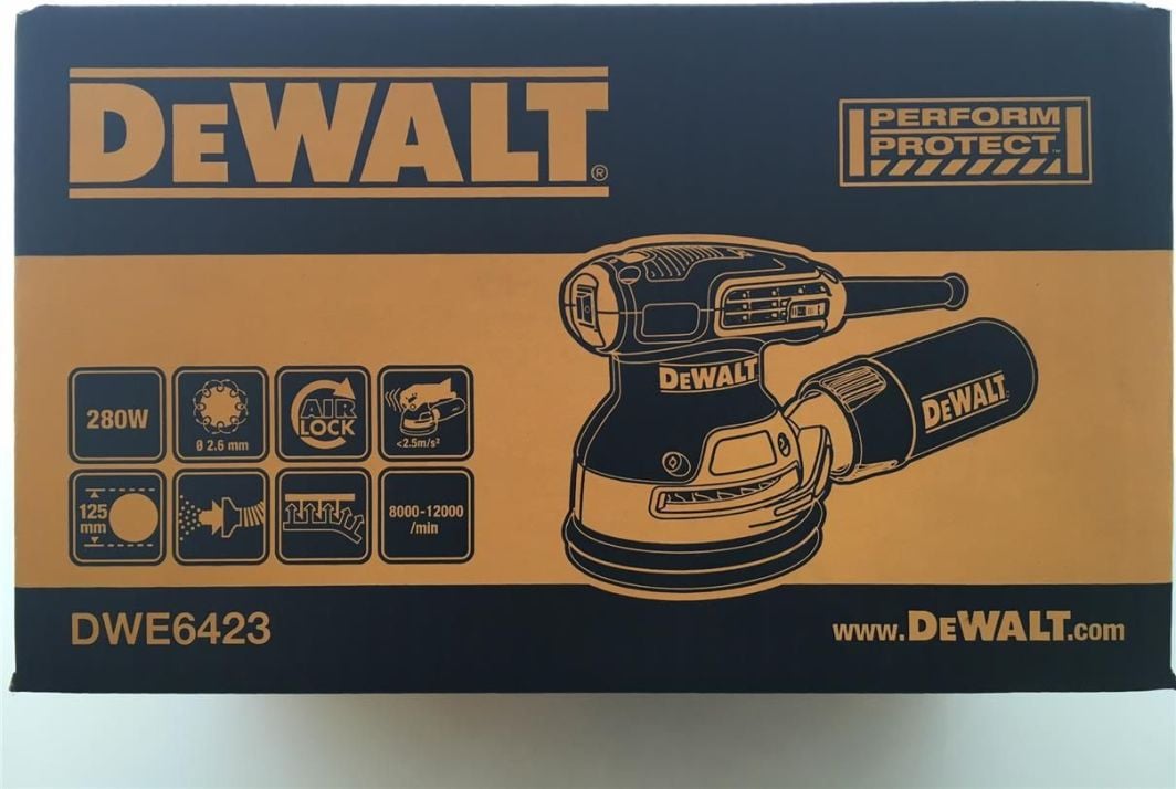 Ексцентрикова шліфувальна машина потужністю 125 мм потужністю 280 Вт із верхнім хвостовиком (DWE6423) Двигун потужністю 280 Вт зі змінною швидкістю в діапазоні 8000-12000 обертів на хвилину забезпечує ідеальний вибір швидкості шліфування для всіх матеріалів Низький рівень вібрації забезпечує більш тривалий час роботи без втоми Вбудоване гніздо для відсмоктування пилу забезпечує пряме підключення до пилососа за допомогою DEWALT Система AirLock Антиковзаюча рукоятка верхньої ручки та корпусу, дає відчуття повного комфорту та контролю під час використання Пилозахисний перемикач запобігає забрудненню Система контролю фінішної обробки дозволяє контролювати швидкість та зменшує перешкоди вимірювання під час запуску Усі пилозахищені кулькові підшипники Компактна структура дозволяє легко захоплювати рукою Швидка заміна шліфувального паперу «на липучці» з хорошою адгезією Технічні дані: Споживана потужність 280 Вт Ефективна потужність 120 Вт Кількість кругових рухів за хвилину 8000 – 12000 об/хв Розмір кругового руху 2,6 мм Розмір паперу 125 мм Вага 1,28 кг