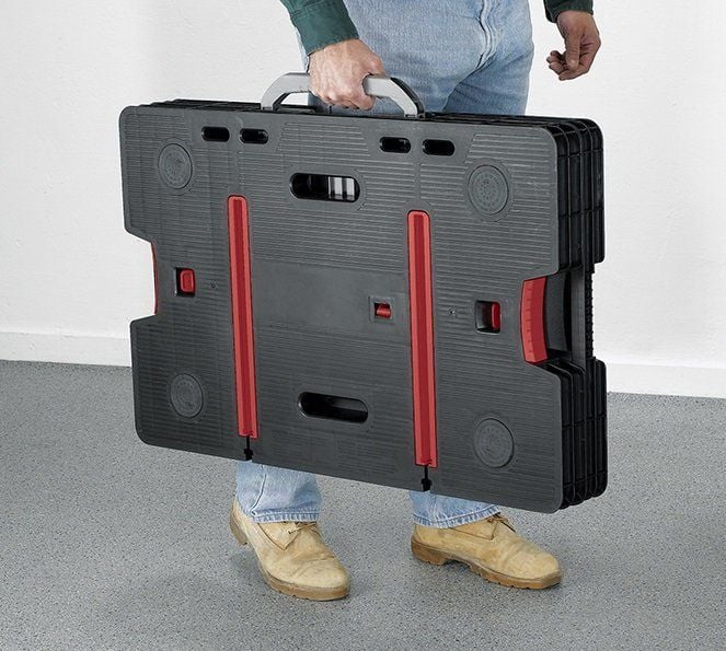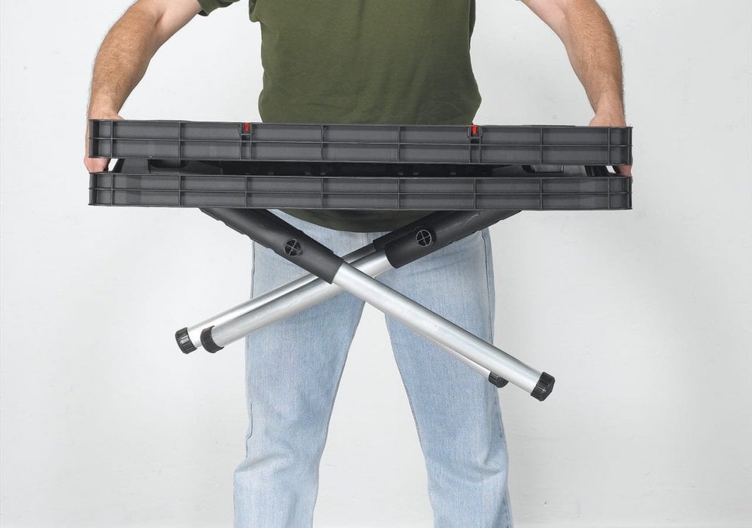 Складний верстак (237005) Практичний стіл, адаптований для роботи в різних умовах.Універсальна портативна конструкція оснащена системою, яка дозволяє швидко складати та розбирати.Великий робочий простір столу з міцністю до 453 кг/1000 фунтів також дає змогу працювати на передовій основі.Продукт у наборі має два затискачі 30 см/12″, які забезпечують стабільність робочої поверхні та безпечну експлуатацію. Відмінний продукт як для вимогливих ентузіастів DIY, так і для професіоналів, які цінують функціональні рішення. Розміри стільниці – 550 мм x 840 мм (висота в складеному вигляді – 110 мм, висота в розкладеному вигляді – 770 мм, робоча довжина затискача – 310 мм, висота затискача – Конструкція 65 мм дозволяє складати і розкладати стіл за кілька секунд.