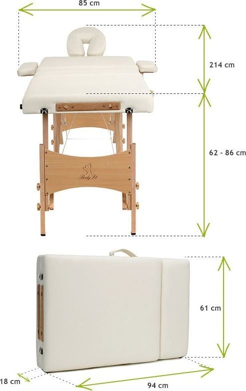 3-сегментне масажне ліжко BodyFit забезпечує високий комфорт і зручність роботи людям, які проходять різні процедури.Підйомна, 10-ступінчаста, регульована панель дозволяє встановити стіл в положення лежачи або сидячи.Легке регулювання висоти в діапазоні 61-83 см дозволить вам адаптувати його до ваших потреб миттєво.Корисна поверхня покрита екологічною шкірою, під якою знаходиться густий поролон, що забезпечує м’якість.Для підвищення комфорту ліжко оснащене функціональними аксесуарами, такими як: бічні підлокітники, які додають кілька додаткових сантиметрів до ширини столу, передній підлокітник, який забезпечує більший доступ до рук і дає відпочинок рукам, регульований підголівник у формі підкови, кишені для косметики, які завжди будуть під рукою, вішалка для рушників, додатковий отвір для обличчя в стільниці.Ліжко разом з аксесуарами, які поміщаються всередині, складається у валізу, що закривається на пряжки.Ми складаємо все в транспортний чохол, що входить в комплект, завдяки чому ми можемо комфортно пересуватися.Чохол додатково оснащений плечовим ременем і місцем для масажного ролика.Наші масажні ліжка мають відповідні сертифікати, що підтверджують їх якість і відповідність директивам щодо виробів медичного призначення.загальна довжина столу: 195,0 см загальна довжина столу з підголівником: 223,0 см загальна ширина: 70,5 см загальна ширина з підлокітниками: 93,5 см довжина підлокітника: 38,5 см регульована висота: 61,0 – 83,0 см довжина підйомної панелі: 60,5 см довжина складеного ліжка: 97,0 см ширина складеного ліжка: 15,5 см висота складеного ліжка: 70,5 см