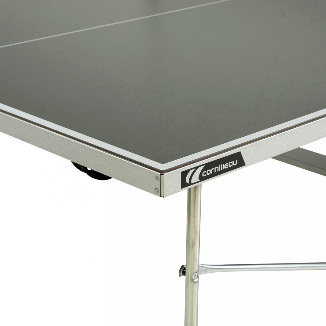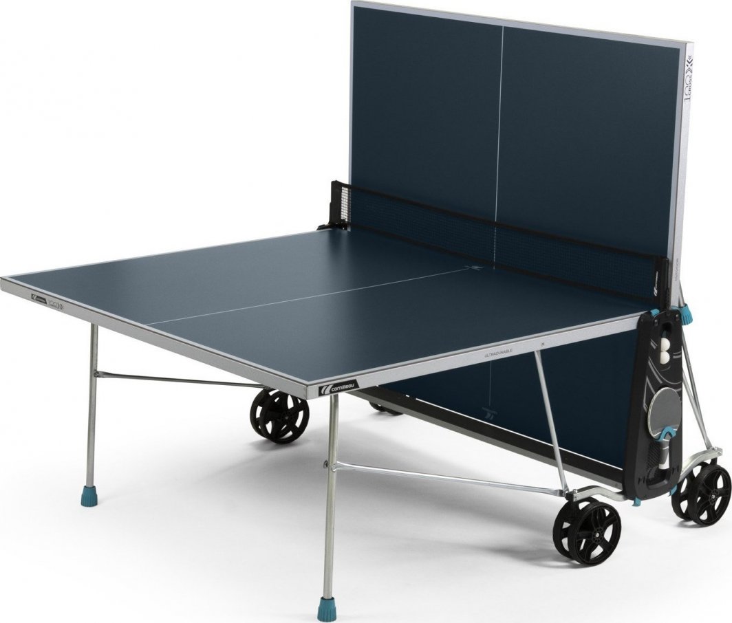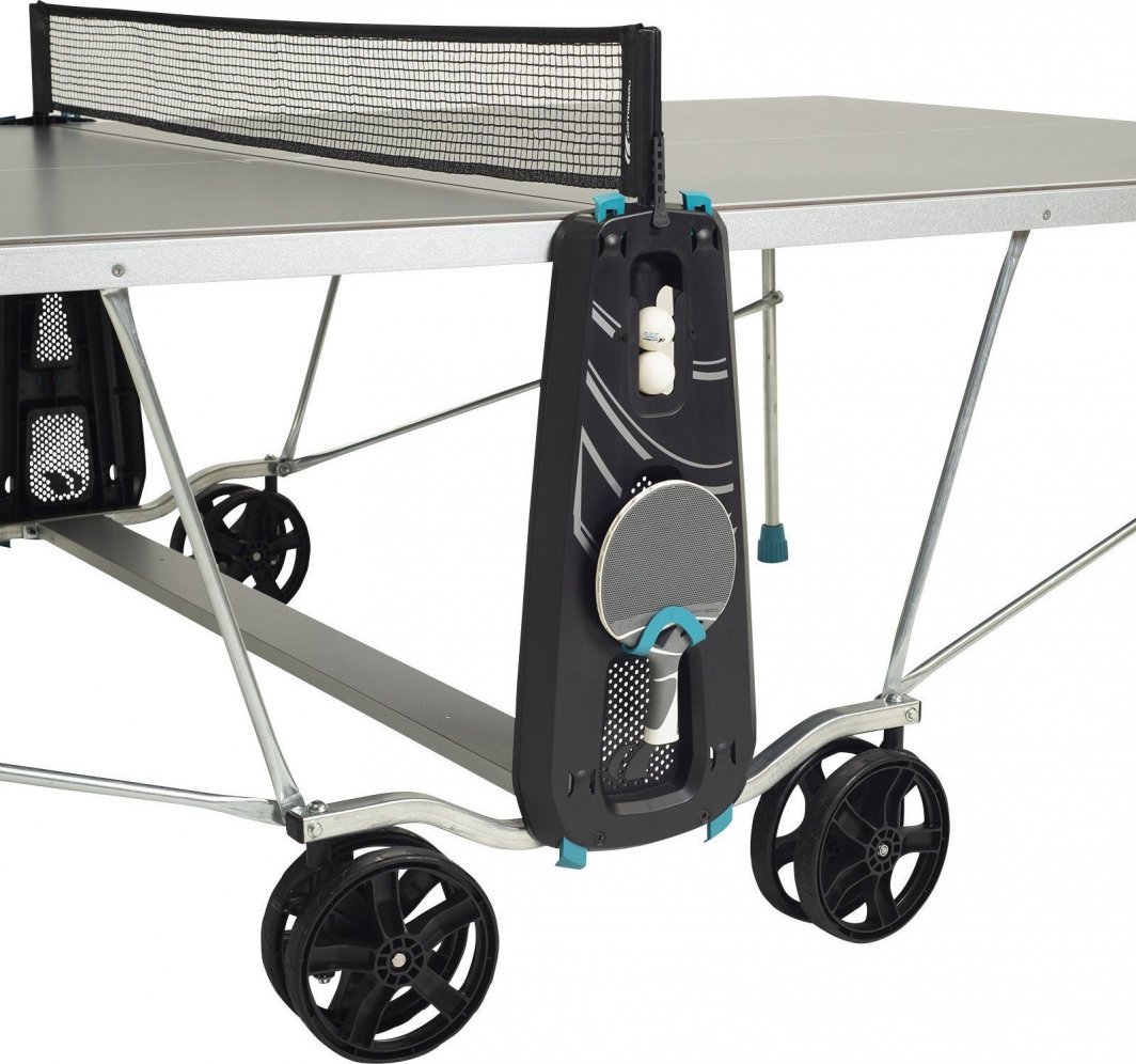 Тенісний стіл 100X Outdoor Cornilleau синій Тенісний стіл Cornilleau 100X – чудове обладнання для початківців.Стіл стійкий до будь-яких погодних умов, що дозволяє зберігати його на відкритому повітрі, не побоюючись пошкодження.Поверхня стільниці стійка до будь-яких видів ударів, подряпин і сонячних променів.Стільниця товщиною 4 мм виготовлена з полімерного ламінату, покритого антибліковим покриттям.Стільниця «оточена» алюмінієвою рамою.Відрегулювати натяг сітки дуже просто.Добре натягнута сітка – запорука відмінної гри.Колеса на столі Cornilleau 100X були розроблені, щоб підвищити стійкість столу та полегшити його переміщення.Кишені для аксесуарів з обох боків столу дозволяють зберігати 4 м’ячі та 2 ракетки.Це дає вам швидкий доступ до обладнання, необхідного в грі, і полегшує підтримку порядку.Технічні дані: розміри столу в розкладеному вигляді: 274 x 152,5 x 76 см. Загальна товщина столу: 44 мм. Стільниця: 4 мм. Колір стільниці з полімерного ламінату: блакитний. Покриття поверхні столу: SOFTMAT Фіксація столу з системою PUSH’N LOCK, 8 точок блокування, фіксація в двох положеннях. Ніжки стільниці прямі, посилені пластиковою регулювальною ніжкою, діаметр: Діапазон регулювання висоти столу 50 мм: сітка від -1 до + 5 см з регульованими колесами натягу: подвійні (8 шт.) Розміри колеса (товщина x діаметр): 32 x 200 мм Рама стільниці: алюцинк, товщина 40 мм Розміри складеного столу: 167 x 155 x 75 см Вага столу з антибліковим покриттям: 47 кг Клас столу: Стандарт D: EN 14468-1 для домашнього використання, в готелях