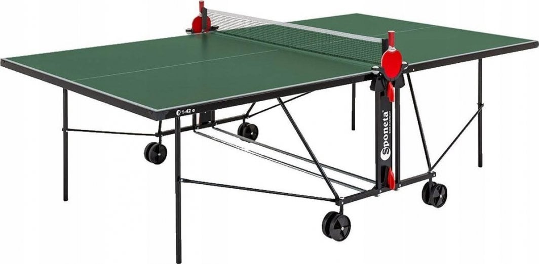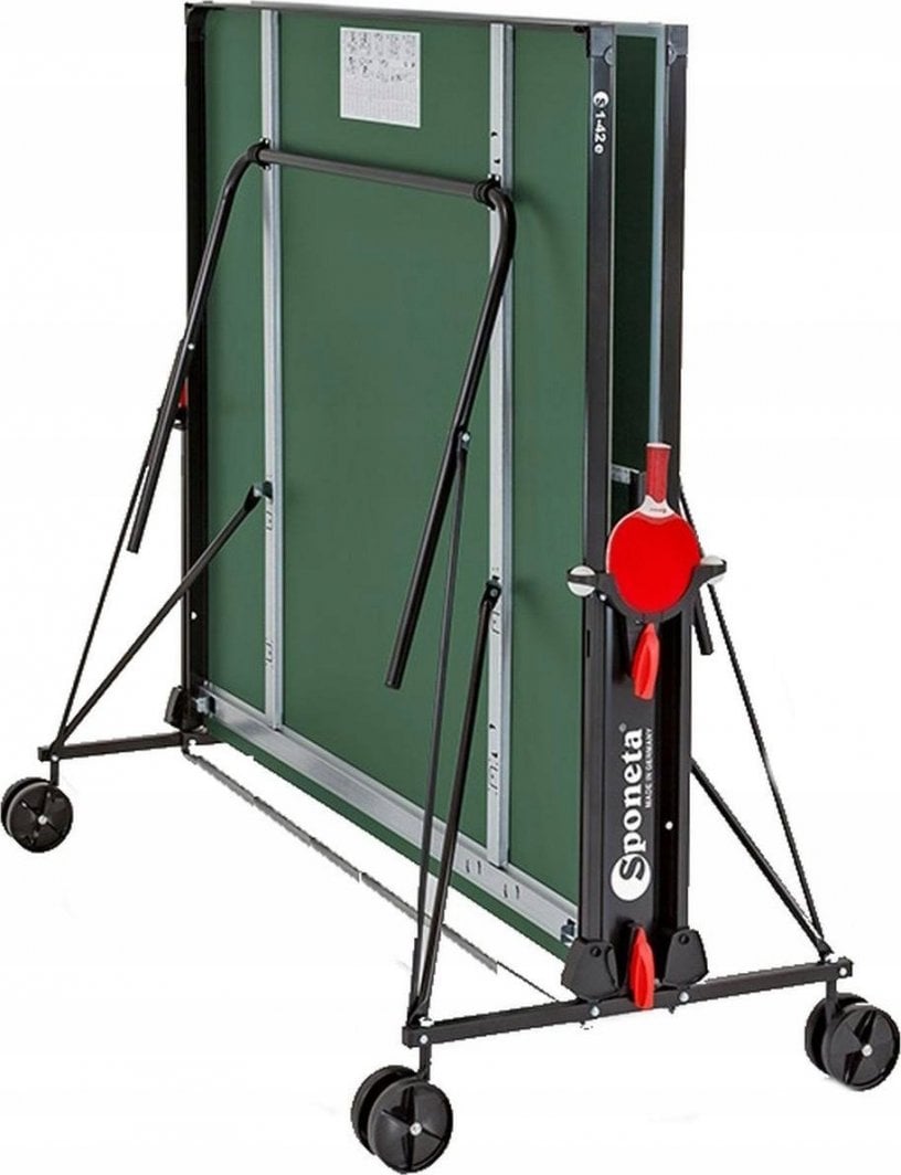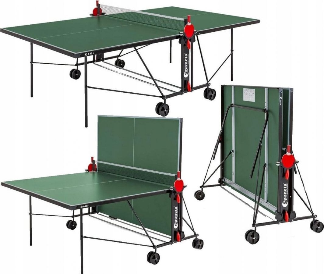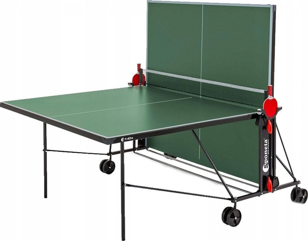 Стіл для настільного тенісу Sponeta S1-42e WATERPROOF – ідеальний вибір для любителів тенісу. Стіл для настільного тенісу Sponeta S1-42e WATERPROOF – відмінний вибір для тих, хто хоче насолодитися грою на природі.Цей стіл, який є частиною серії Sponeta Hobbyline Outdoors, поєднує міцність і функціональність, що робить його ідеальним рішенням як для початківців, так і для сімей.Завдяки високій якості виготовлення та стійкості до різних погодних умов стіл забезпечує тривале задоволення від гри.Водонепроникний і стійкий до погодних умов Стіл Sponeta S1-42e створений для ігор на вулиці.Виготовлений з плити з меламінової смоли товщиною 4 мм, він стійкий до вологи та має обмежену ударостійкість.Завдяки цьому навіть у складних погодних умовах стіл зберігає свої властивості та довговічність.Складна система для тренувань однієї людини Функціональність столу Sponeta S1-42e дозволяє легко складати, що сприяє тренуванню однієї людини.Ця система робить стіл надзвичайно практичним і пристосованим до потреб гравців, які хочуть вдосконалювати свої навички в будь-який час.Поворотна ручка з механізмом фіксації Стіл оснащений поворотною системою фіксації з ручкою, що забезпечує стабільність під час гри.Завдяки цьому навіть інтенсивні матчі не вплинуть на його положення, що важливо для комфорту та безпеки гравців.Розміри і вага тенісного столу Стіл Sponeta S1-42e має наступні розміри: Розкладений: 274 x 152,5 x 76 см Для зберігання: 155,5 x 74 x 165,5 см Вага столу становить 50 кг (брутто) і 47,5 кг (нетто), що робить його стійким і в той же час легким для переміщення завдяки чотирьом подвійним колесам.Аксесуари в комплекті: сітка і тримачі для ракеток. Стіл містить чорну сітку «BASIC stationary» і практичні тримачі для ракеток і м’яча, що підвищує комфорт використання і дозволяє легко зберігати аксесуари.Технічні характеристики столу Sponeta S1-42e Виробник: Sponeta Модель: S1-42e EAN: 4013771139745 Код виробника: 139745 Домінуючий колір: зелений Матеріал: плита з меламінової смоли, сталь Товщина плити: 4 мм Обмежена ударостійкість: так Вологостійкість: так Профіль рами: L-36 мм, порошкове покриття Колір профілю рами: чорний (RAL 9005) Тип рами: Компактна (тип 4b) Трубчастий профіль: 25 мм, порошкове покриття Кількість коліс: 4 (діаметр 125 мм, 2 поворотних колеса) Розміри в розкладеному вигляді: 274 x 152,5 x 76 см Розміри для зберігання: 155,5 x 74 x 165,5 см Вага брутто: 50 кг Вага нетто: 47,5 кг Додаткові аксесуари: чорна сітка «BASIC stationary» Замовляйте зараз, щоб насолодитися найкращою якістю ігор на вулиці!Ідеально підходить для ваших потреб – доступний сьогодні в Apricot!