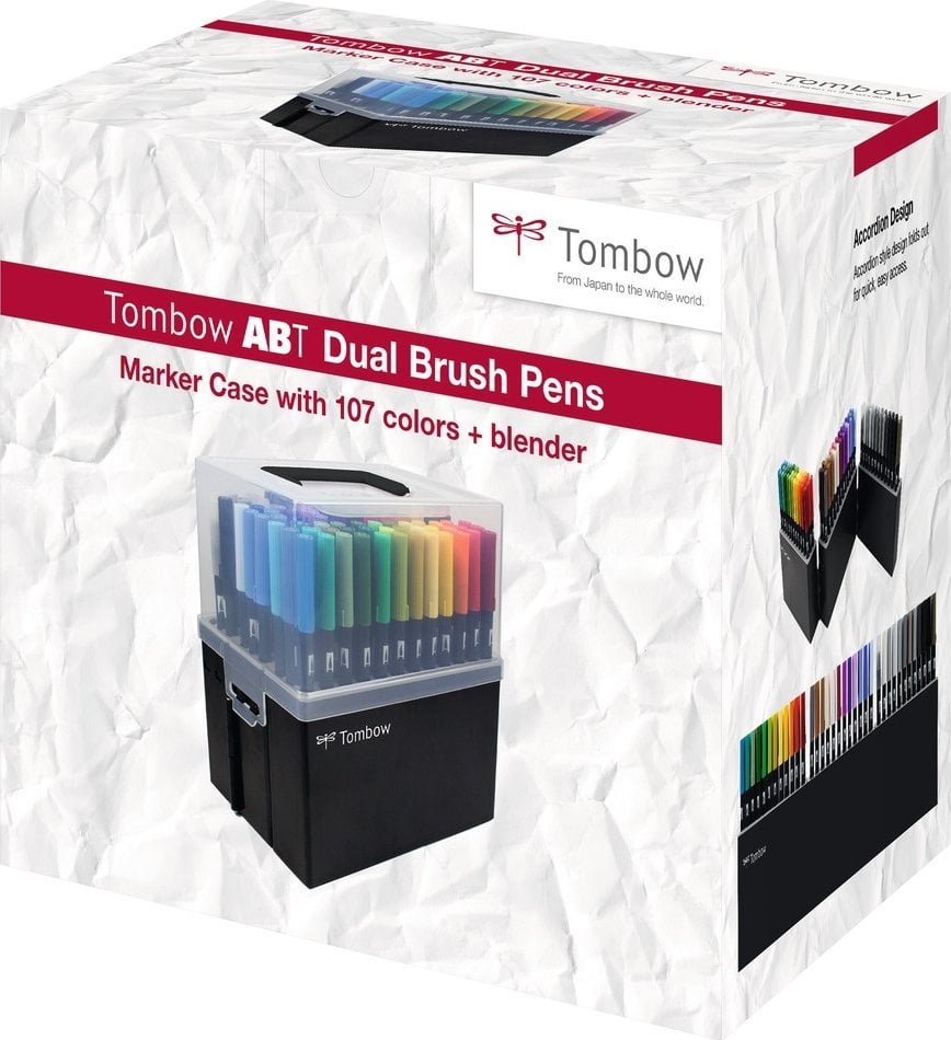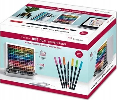 Органайзер із 108 ручками Tombow ABT Dual Brush Мрієте про ідеальні ручки для рукописного введення, каліграфії чи малювання літер?Бренд Tombow знову дивує своїм продуктом – ABT Dual Brush Pen в коробці для ручок!Ручки мають два кінці: тонкий кінець для точних ліній і більш товстий кінець пензля.Вони ідеально підходять для заповнення великих поверхонь, а також для створення делікатних і деталізованих елементів.Усі 107 кольорів і блендер доступні в практичній коробці для ручок, яка забезпечує легкий доступ і порядок.Ручки виготовлені з води, тому безпечні для здоров’я та екологічні. Ручки з двома наконечниками.Тонкий наконечник забезпечує точні лінії. Виготовлений на водній основі. Ідеально підходить для рукописного введення. Коробка для ручок, що відкривається, забезпечує легкий і швидкий доступ