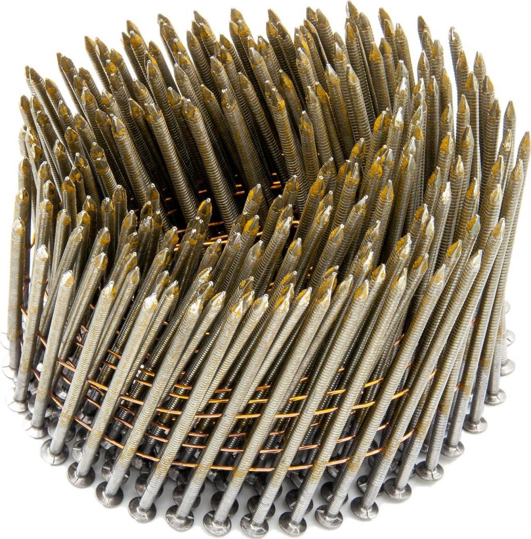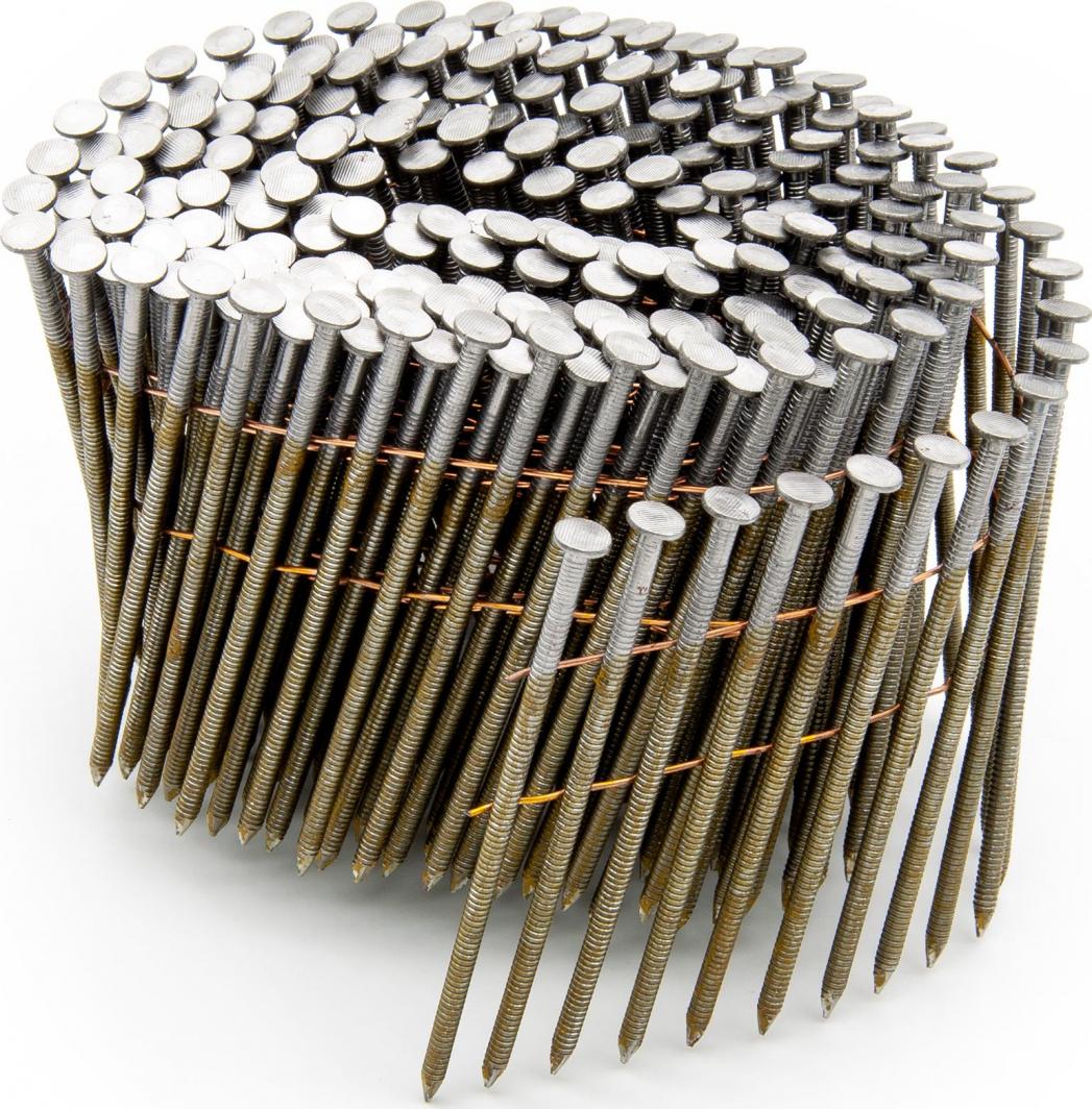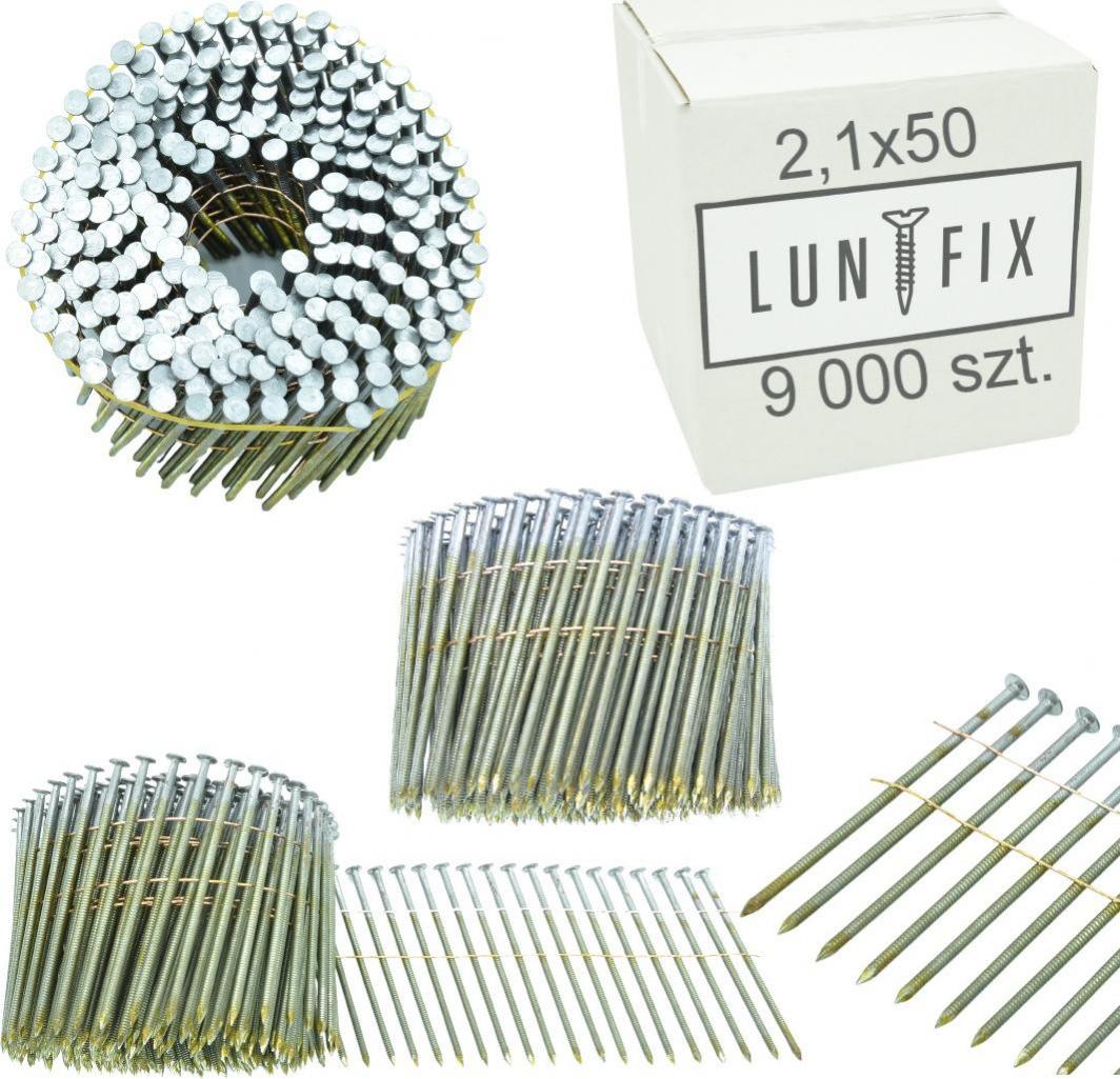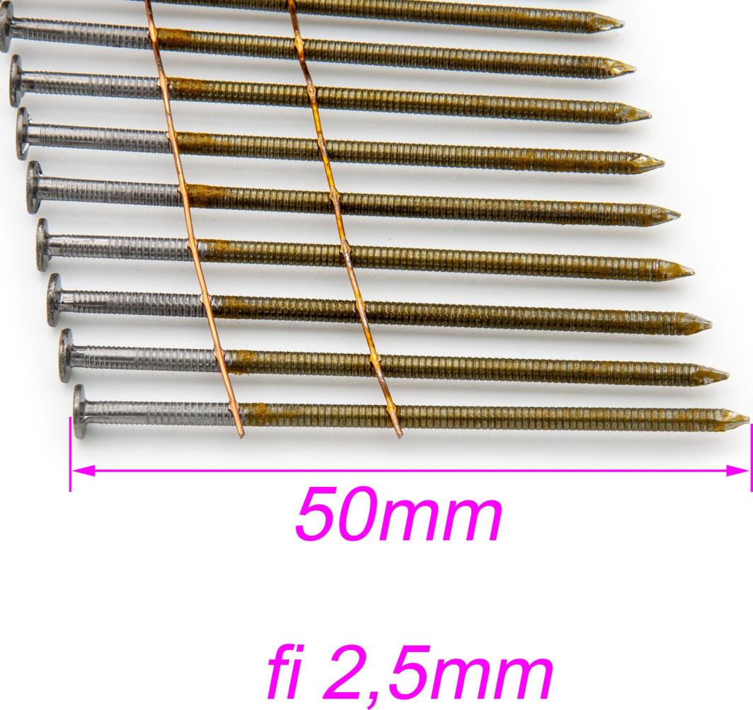 Кільцеві цвяхи LUN FIX в бухтах – з’єднані дротом під кутом 16° Ми пропонуємо різні розміри. Подивіться відео про наш продукт: https://www.youtube.com/watch?v=4FJDZNBTdzU розміри: товщина 2,5 мм, довжина 5 0 мм, цвяхи кріпляться до дроту під кутом 16° в одній упаковці – 9000 шт. універсальний продукт, підходить для більшості цвяхів барабани пристосовані для роботи під кутом 16° мають ребра, що збільшують опір зусиллям витягування жорсткіші ніж гладкі цвяхи, що зменшує ймовірність згинання цвяхів під час забивання не оцинковані, «чорні»