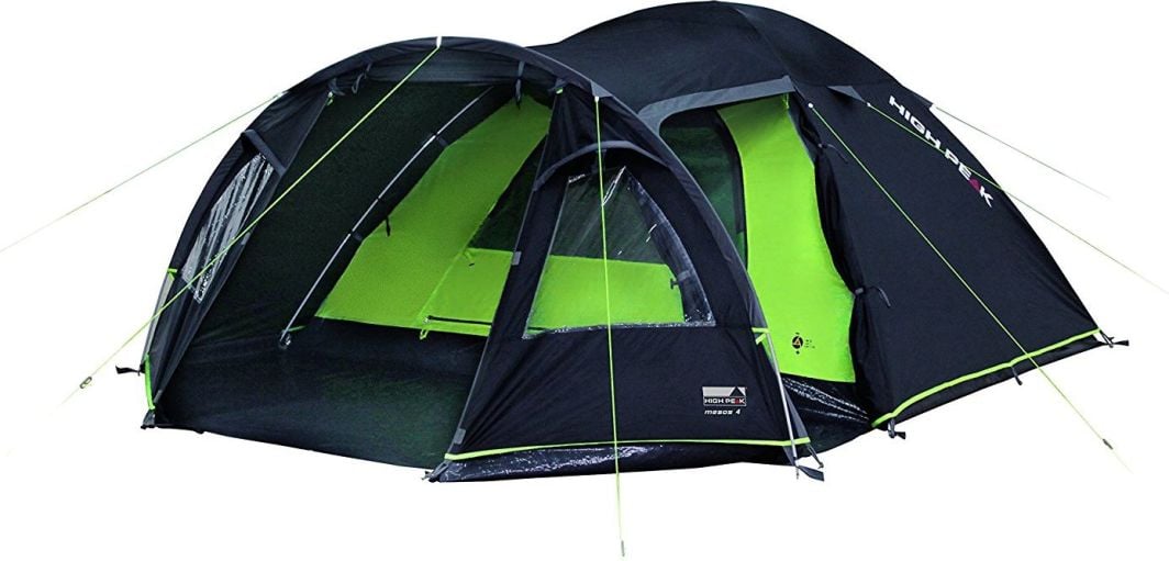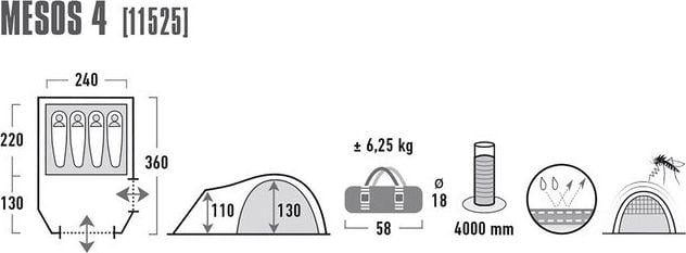 НАМЕТ HIGH PEAK MESOS 4 людини 11525 Дуже зручний, високий сімейний намет з двома входами та великим тамбуром.Просторий хол з підлогою відмінно підійде в якості кухні або підсобного приміщення.Ламіновані шви та водонепроникність 4000 мм гарантують дуже хороший захист від дощу.Вентиляційні отвори забезпечують постійну циркуляцію повітря.Вхід обладнаний москітною сіткою для захисту від комах.Специфікація: Кількість осіб: 4 Водонепроникність: 4000 мм водяного стовпа Покриття: 100% поліестер, поліуретан, проклеєні шви Спальня: 100% дихаючий поліестер, сітчастий вхід Підлога: 100% поліетилен (PE) Каркас: лущене волокно Розміри: 220 (+130 тамбур) x 240 см Висота: 130 см Розміри в складеному вигляді: 58 х 18 см. Вага: 6,25 кг