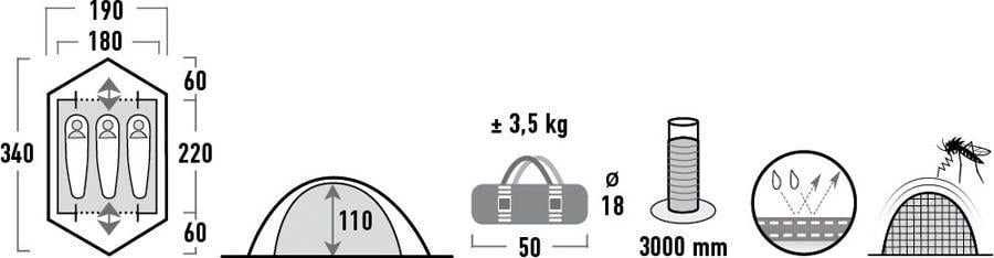 3-місний намет іглу.Вхід оснащений москітною сіткою, яка захищає від настирливих комах.Ламіновані шви та водонепроникність 3000 мм водяного стовпа гарантують дуже хороший захист від дощу.Мала вага та розмір упаковки роблять Woodpecker ідеальним компаньйоном для пішохідних та велосипедних груп.Технічні дані: Водонепроникність: 3000 мм водяного стовпа Розміри в розкладеному стані: 180 x 220 (+ 85 см тамбур) Висота: 100 см Розміри в складеному стані: 50 x 18 см Вага: 3,5 кг