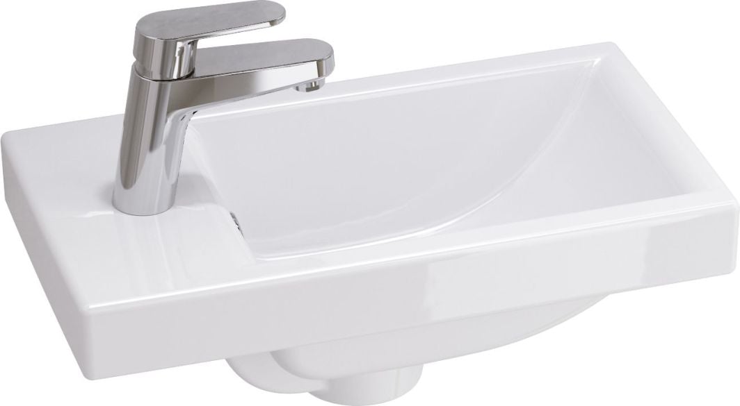 Умивальник COMO 40 см з отвором – K32-001-BOX Ціна стосується тільки умивальника Серія Меблеві умивальники Ширина: 40 см Форма: Прямокутна Стиль: Модерн Отвори для змішувачів: 1 – реверсивна модель (отвір можна розташувати з правого або лівого боку) Довжина: 22 см Кріплення: за допомогою шурупів Можливість встановлення за допомогою серії COLOR шафи, GALAXY, MELAR, MESTA, SMART, XANTIA ED