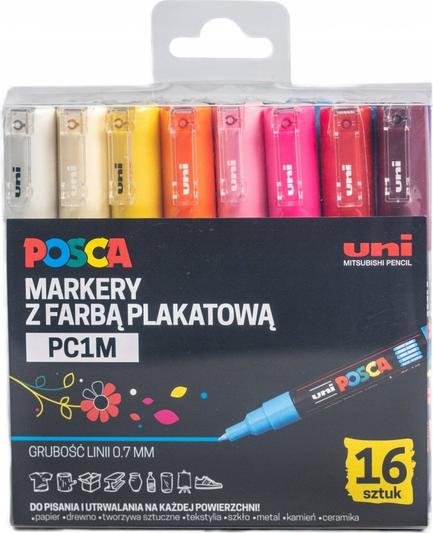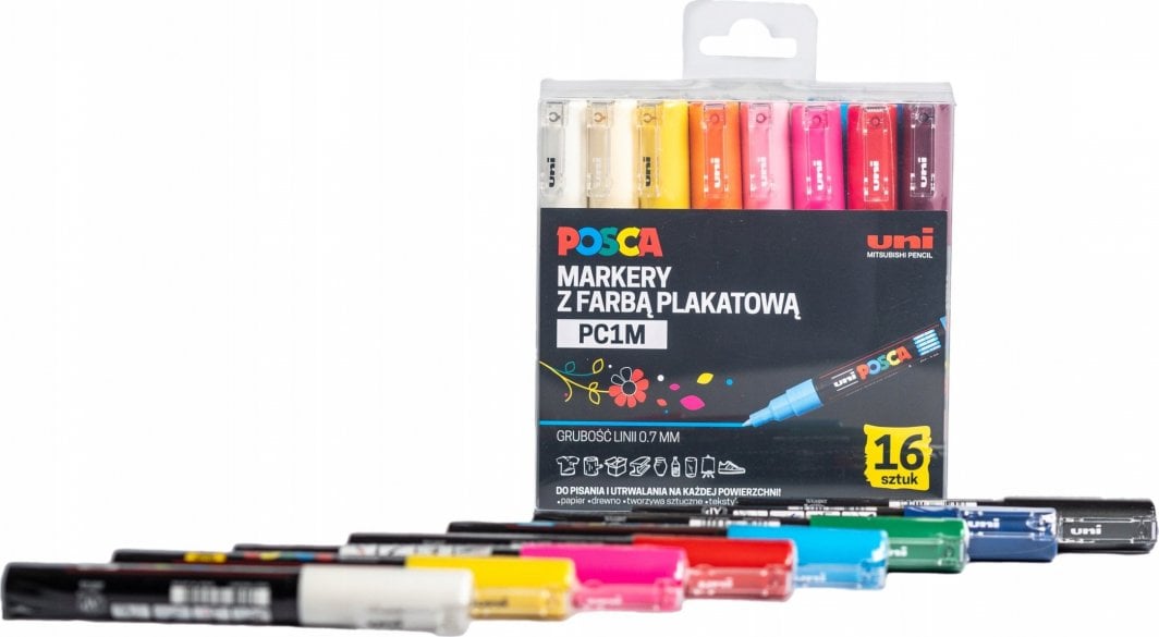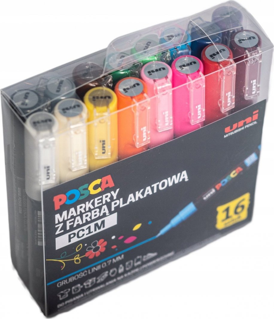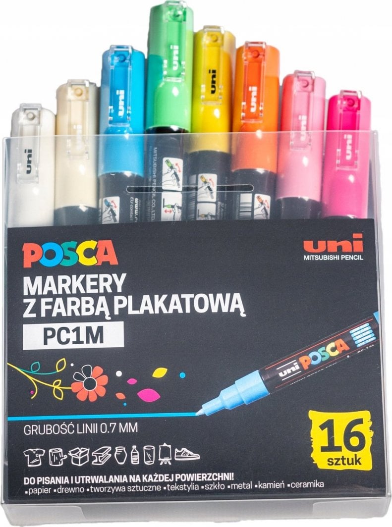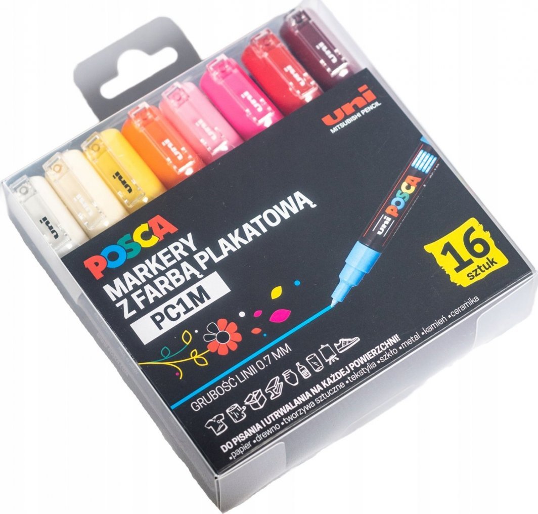 НАБІР 16 ДЕКОРАТИВНИХ МАРКЕРІВ POSCA PC-1M З ПЛАКАТНОЮ ФАРБОЮ ДЛЯ МАЛЮВАННЯ ТА НАПИСУ НА БУДЬ-ЯКІЙ ПОВЕРХНІ: Маркери призначені для написання та малювання на будь-якій поверхні: папір, тканина, пластик, теракота, скло, порцеляна, метал, дерево.Вони стійкі до світла та погодних умов, а після висихання кольори чорнила не поєднуються між собою.Чорнила на водній основі не просочують папір!• маркер із плакатною фарбою • форма наконечника: кругла • товщина лінії письма: 0,7 мм ДО НАБОРУ ПЕРЕДАЮТЬСЯ ТАКІ КОЛЬОРИ: БІЛИЙ ЧОРНИЙ ЧЕРВОНИЙ СВІТЛО-СИНІЙ СИНІЙ РОЖЕВИЙ ЗЕЛЕНИЙ ЖОВТИЙ КОРИЧНЕВИЙ ТЕМНО-ЧЕРВОНИЙ ФІОЛЕТОВИЙ СВІТЛО-РОЖЕВИЙ СВІТЛО-ЗЕЛЕНИЙ КОЛЬОР СЛОНОВОЇ КІСТКИ ОРАНЖЕВИЙ СІРИЙ
