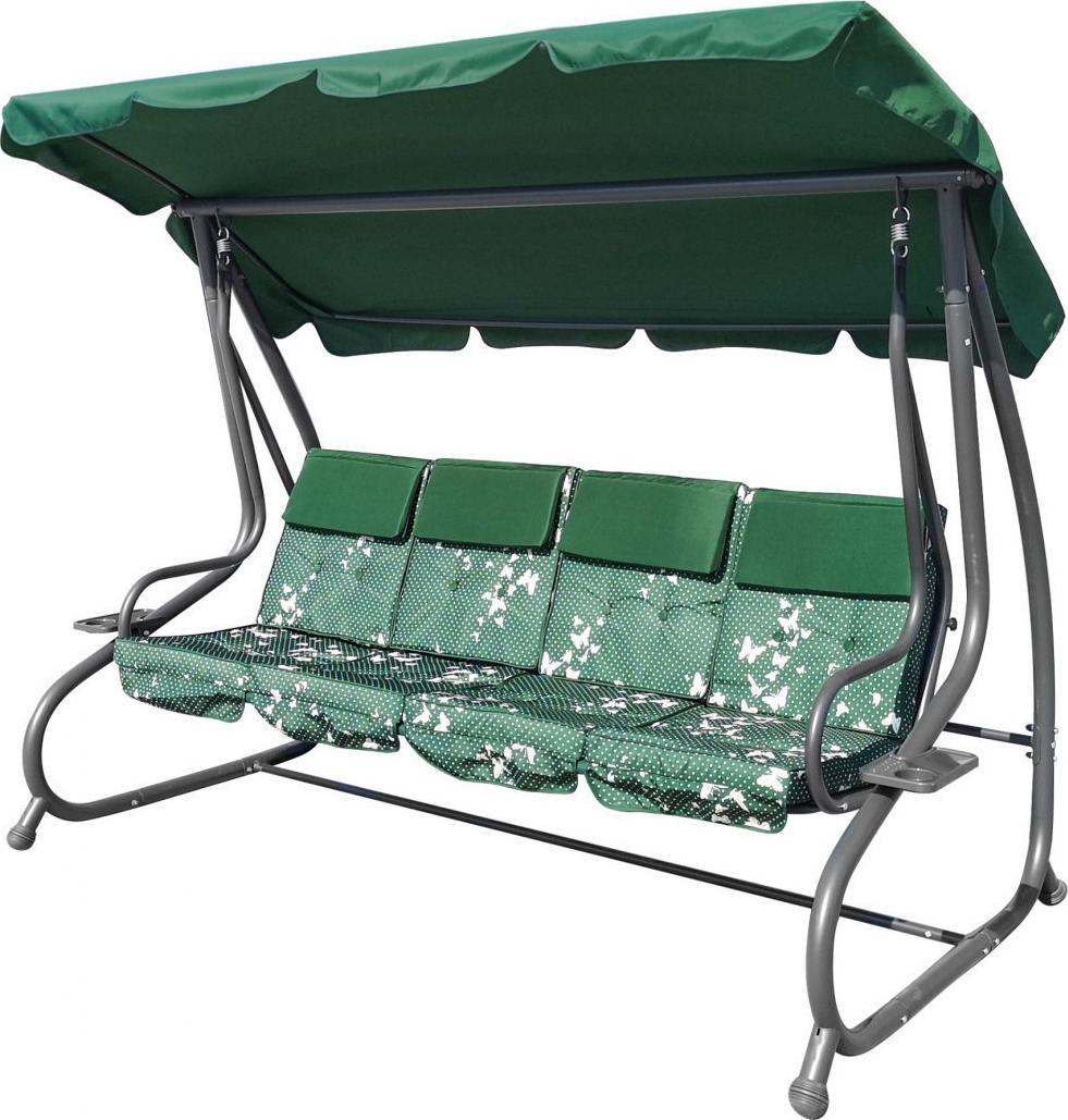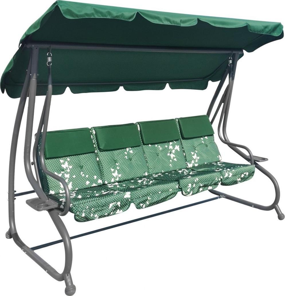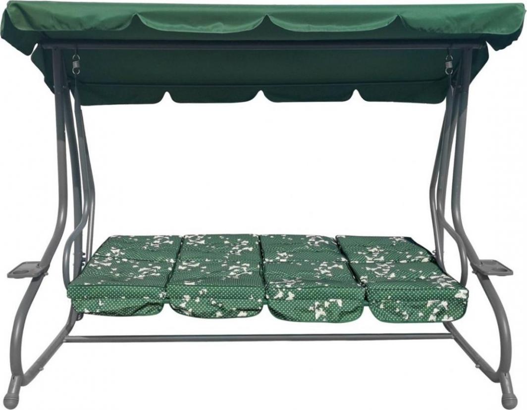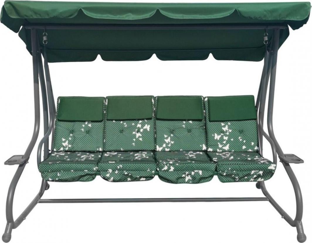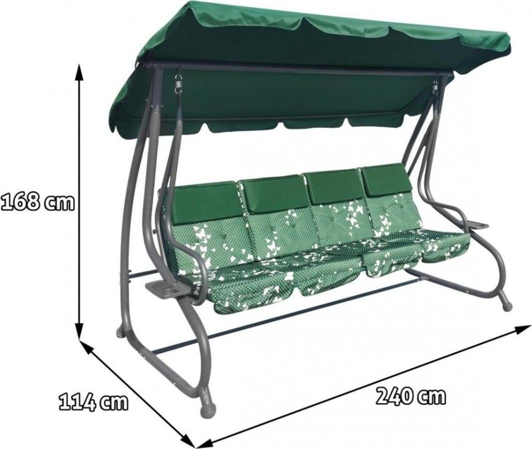 Опис Садова гойдалка з відкидним сидінням і регульованим дахом, зелена з малюнком. Сидіння виготовлено з матеріалу Textiline з переплетенням 2х1. Матеріал, з якого виготовлена ​​сітка, – поліефірна пряжа, покрита вінілом.Textiline призначений для зовнішнього використання завдяки високій стійкості до суворих погодних умов.Сітка надзвичайно гнучка і стійка до розтягування, що додатково впливає на комфорт використання, а сам матеріал не деформується.багатоступінчасте, плавне регулювання навісу, чохол навісу з поліестеру щільності 180 г, зручне розкладне сидіння, яке можна використовувати як для сидіння, так і для лежання, 4 окремих сидіння, наповнені губкою для оббивки, бл. Ширина 6 см, 2 підставки для напоїв, кріплення гойдалки на пружинах, конструкція зі сталі з порошковим покриттям, високоякісні зварні шви, висока стійкість до погодних умов, масивна нековзна гума на кінцях ніжок, дуже легко підтримувати в чистоті, чохли на сидіння з поліестеру вагою 160 г, максимальне навантаження 300 кг, розміри Зовнішні розміри ширина прибл. 240 см, глибина бл. 114 см, висота плафону в центральній частині бл. 168 см, вага прибл. 46 кг, висота сидіння, спинки без матраца прибл. 50 см, глибина сидіння без матраца прибл. 48 см, довжина сидіння без рами прибл. 193 см, ширина сидіння в розкладеному стані бл. 100 см, довжина купола прибл. 230 см, ширина бл. 117 см, ширина подушки сидіння прибл. 48 см, висота сидіння бл. 51 см, висота спинки бл. 51 см, ширина в розкладеному вигляді прибл. 101 см, Пакувальний набір складається з двох упаковок 230x57x16 см 28,5 кг 200x57x16 см 23,5 кг Товщина трубок ніжок рами 48 х 1,1 мм, верхньої рами 48 х 1,1 мм, рами сидіння 32 х 1,2 мм, посилення гойдалок 25 х 0,8 мм, рами сидіння 28 х 1,5 мм, рама навісу 16 х 0,6 мм