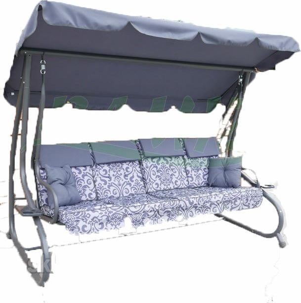 Опис Садові гойдалки зі складаним сидінням і регульованим навісом, сірі з візерунком [8078 PATTERN SZ] Сидіння виготовлено з матеріалу Textiline з переплетенням 2х1. Матеріал, з якого виготовлена ​​сітка, – поліефірна пряжа, покрита вінілом.Textiline призначений для зовнішнього використання завдяки високій стійкості до суворих погодних умов.Сітка надзвичайно гнучка і стійка до розтягування, що додатково впливає на комфорт використання, а сам матеріал не деформується.багатоступінчасте, плавне регулювання навісу, чохол навісу з поліестеру щільності 180 г, зручне розкладне сидіння, яке можна використовувати як для сидіння, так і для лежання, 4 окремих сидіння, наповнені губкою для оббивки, бл. Ширина 6 см, 2 підставки для напоїв, кріплення гойдалки на пружинах, конструкція зі сталі з порошковим покриттям, високоякісні зварні шви, висока стійкість до погодних умов, масивна нековзна гума на кінцях ніжок, дуже легко підтримувати в чистоті, чохли на сидіння з поліестеру вагою 160 г, максимальне навантаження 300 кг, розміри Зовнішні розміри ширина прибл. 240 см, глибина бл. 114 см, висота плафону в центральній частині бл. 168 см, вага прибл. 46 кг, висота сидіння, спинки без матраца прибл. 50 см, глибина сидіння без матраца прибл. 48 см, довжина сидіння без рами прибл. 193 см, ширина сидіння в розкладеному стані бл. 100 см, довжина купола прибл. 230 см, ширина бл. 117 см, ширина подушки сидіння прибл. 48 см, висота сидіння бл. 51 см, висота спинки бл. 51 см, ширина в розкладеному вигляді прибл. 101 см, Пакувальний набір складається з двох упаковок 230x57x16 см 28,5 кг 200x57x16 см 23,5 кг Товщина трубок ніжок рами 48 х 1,1 мм, верхньої рами 48 х 1,1 мм, рами сидіння 32 х 1,2 мм, посилення гойдалок 25 х 0,8 мм, рами сидіння 28 х 1,5 мм, рама навісу 16 х 0,6 мм,