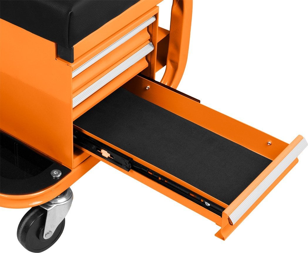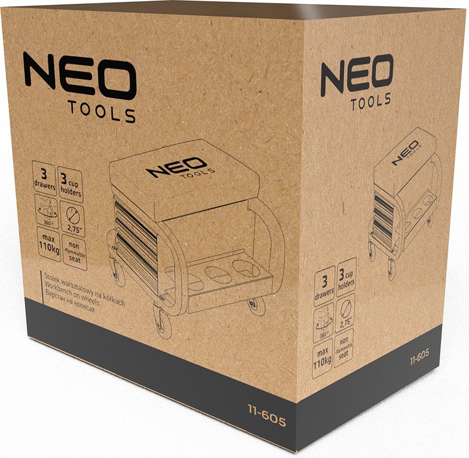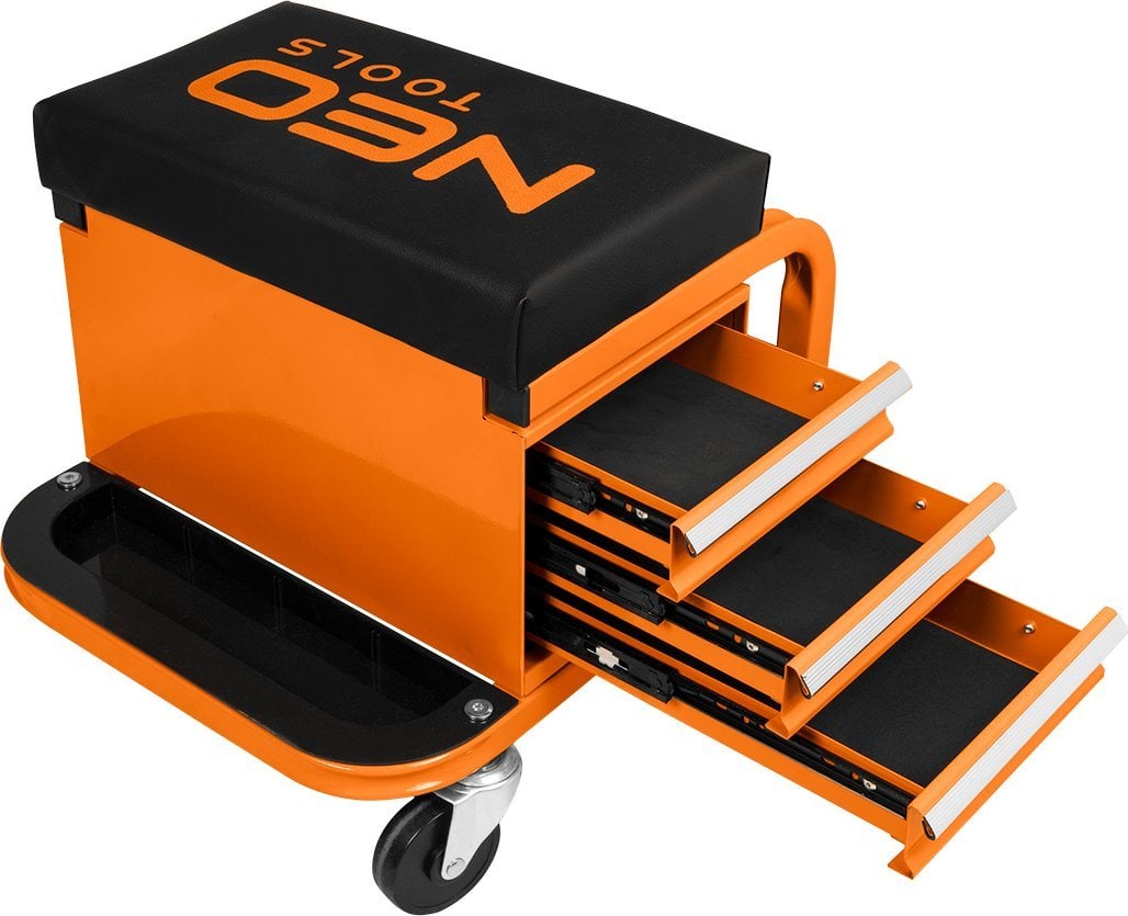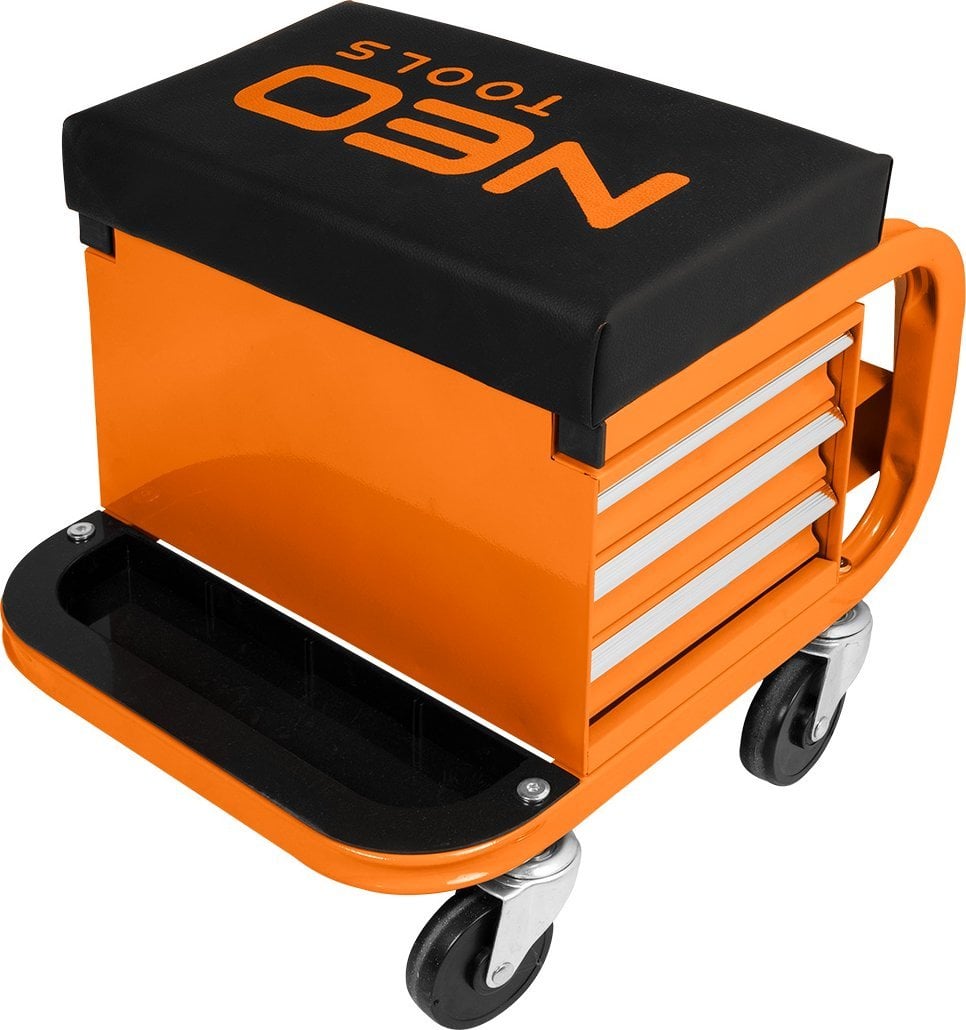Верстак на колесах з ящиками для інструментів (11-605) Верстат NEO TOOLS на колесах з ящиками для інструментів – незамінне рішення для кожного професіонала, який цінує комфорт і функціональність.Міцна конструкція з вантажопідйомністю до 110 кг гарантує безпеку під час інтенсивної роботи.Компактні розміри 38 х 39 х 37 см дозволяють легко помістити табурет NEO TOOLS на будь-якому робочому місці, а ящики розміром 30 х 15 х 4 см дозволяють зберігати необхідні інструменти, які завжди будуть під рукою.Чотири колеса, що обертаються на 360°, забезпечують повну мобільність, дозволяючи вам вільно пересуватися по майстерні.Крім того, стілець NEO TOOLS оснащений трьома тримачами для банок, пляшок або спреїв, що підвищує його практичність.Покрита порошковою фарбою для більшої довговічності, вона має чорне сидіння з помаранчевим логотипом NEO TOOLS, виготовлене з вогнестійкого матеріалу.Підходить навіть для найскладніших робочих завдань!Застосування Зручне сидіння під час тривалої роботи в майстерні.Зберігання інструментів у легкодоступних ящиках.Зберігання та легкий доступ до банок, пляшок або спреїв у спеціальних тримачах.Підтримання порядку на робочому місці, систематизація дрібних інструментів.Підтримка під час роботи, що вимагає частого переміщення між положеннями.Особливості продукту: табурет для майстерні на коліщатках, з висувними ящиками для інструментів, 4 колеса на 360 градусів, 3 тримачі для банок/пляшок/розпилювачів, порошкове покриття, виготовлено з вогнестійкого матеріалу, чорне сидіння з помаранчевим логотипом NEO TOOLS, однотонне.Міцність до 110 кг.Розмір табурета: 38 х 39 х 37 см, одна шухляда: 30 х 15 х 4 см.