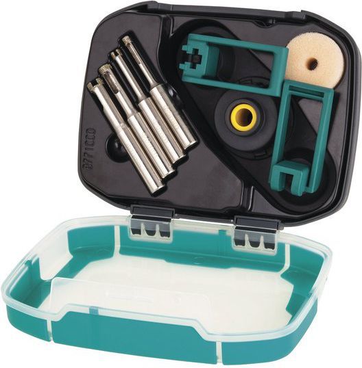 Набір алмазних колодкових пил для плитки 5 – 10 мм 4 шт.(8771000) Опис: 4 x алмазні свердла, ø 5, 6, 8, 10 мм 1 x направляюча, з 2 присосками У пластиковій коробці