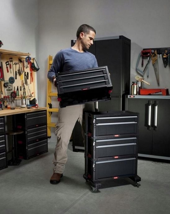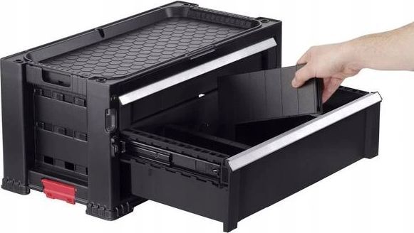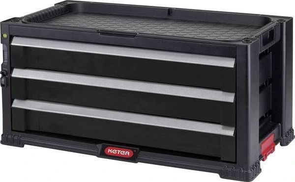 Ящик для інструментів для зберігання з міцного та міцного пластику з трьома висувними ящиками однакового розміру – один ящик все ще поділений на менші відділення для кріплення кріплень та інші невеликі ящики, які можна складати, можна поєднати з ящиком №. 237007, 237790 – ідеально підходить для майстерень або майстерень Технічні дані: ширина: 56 см висота: 26 см глибина: 29 см матеріал: поліпропілен вага: 4,8 кг