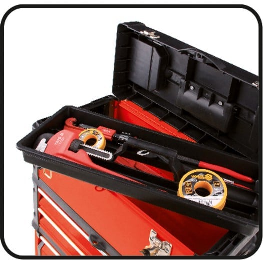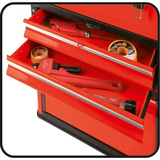 Модульна конструкція Візок для інструментів оснащений 2 висувними органайзерами та лотком для інструментів.Модулі мають плоску верхню частину, яку можна використовувати як стільницю.Крім того, він оснащений канавкою;дуже корисний під час свердління або загвинчування шурупів.Крім того, модулі мають зручну нековзку ручку, бічні ручки для легкого підйому та нековзні нижні кути.Можна розширити 3-модульний комплект до 4-модульного, додавши середній модуль YT-09107 або YT-09108.Верхній і середній модулі мають металеві кріплення для об’єднання в комплекти, а алюмінієва ручка додатково має замок для фіксації модулів. Основою є відбір. Ящики встановлені на металевих напрямних на кулькових опорах.Підноси для інструментів YATO з готовими наборами інструментів можна розмістити в ящиках.У комплект входить нижній ящик, оснащений вбудованими колесами, телескопічна алюмінієва ручка і великий відкидний ящик.Вантажопідйомність нижнього модуля 15 кг, розміри 410x210x280 мм.Середній модуль має 2 металевих ящика вантажопідйомністю 5 кг і розмірами 390x215x60 мм кожен.Верхній модуль являє собою класичний ящик для інструментів розміром 420x220x150 мм і вантажопідйомністю 20 кг.