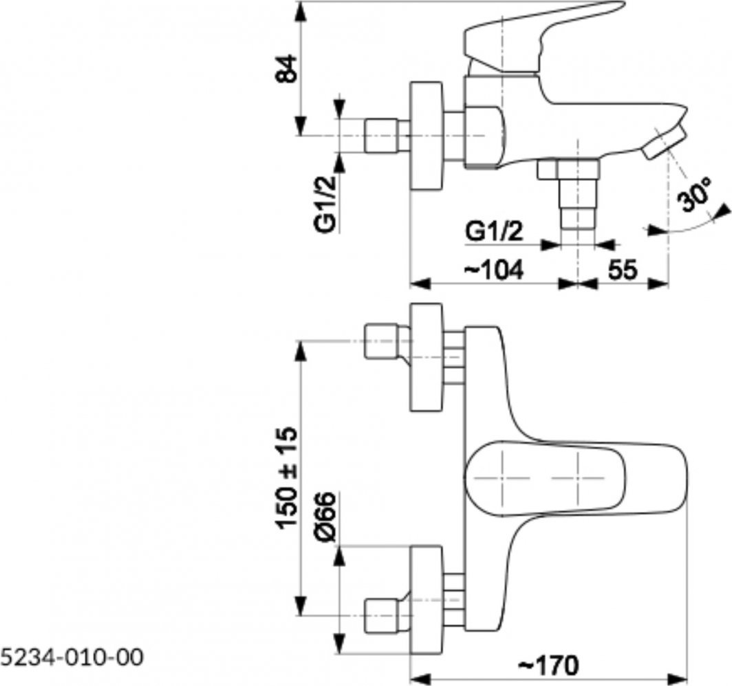 Настінний змішувач для ванни Abasha, хром Індекс: 5234-010-00 Колір: хром EAN: 5907571520423 PKWiU: 28/14/12-33/03/01 Монтаж: на 2 отвори Тип: настінний Матеріал: латунь Елемент управління: Ø35 керамічний регулятор Перемикач: керамічний Аератор: тип Neoperl Rub Clean M28x1 Потік води [л/хв]: 19 Робочий тиск [атм]: 3 Температура води [°C] Макс.: ≤90/65 Акустична група: II Відстань підключення [мм]: 150 ± 15 Противсмоктувальний клапан: так