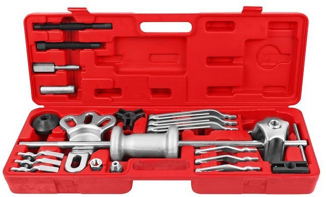 Знімач інерційний для ступиць і підшипників 26 шт.(46869) Опис: Спеціалізований інструмент для демонтажу ступиць. У комплект входить інерційний молоток і дві змінні головки. У набір входить 26 шт.